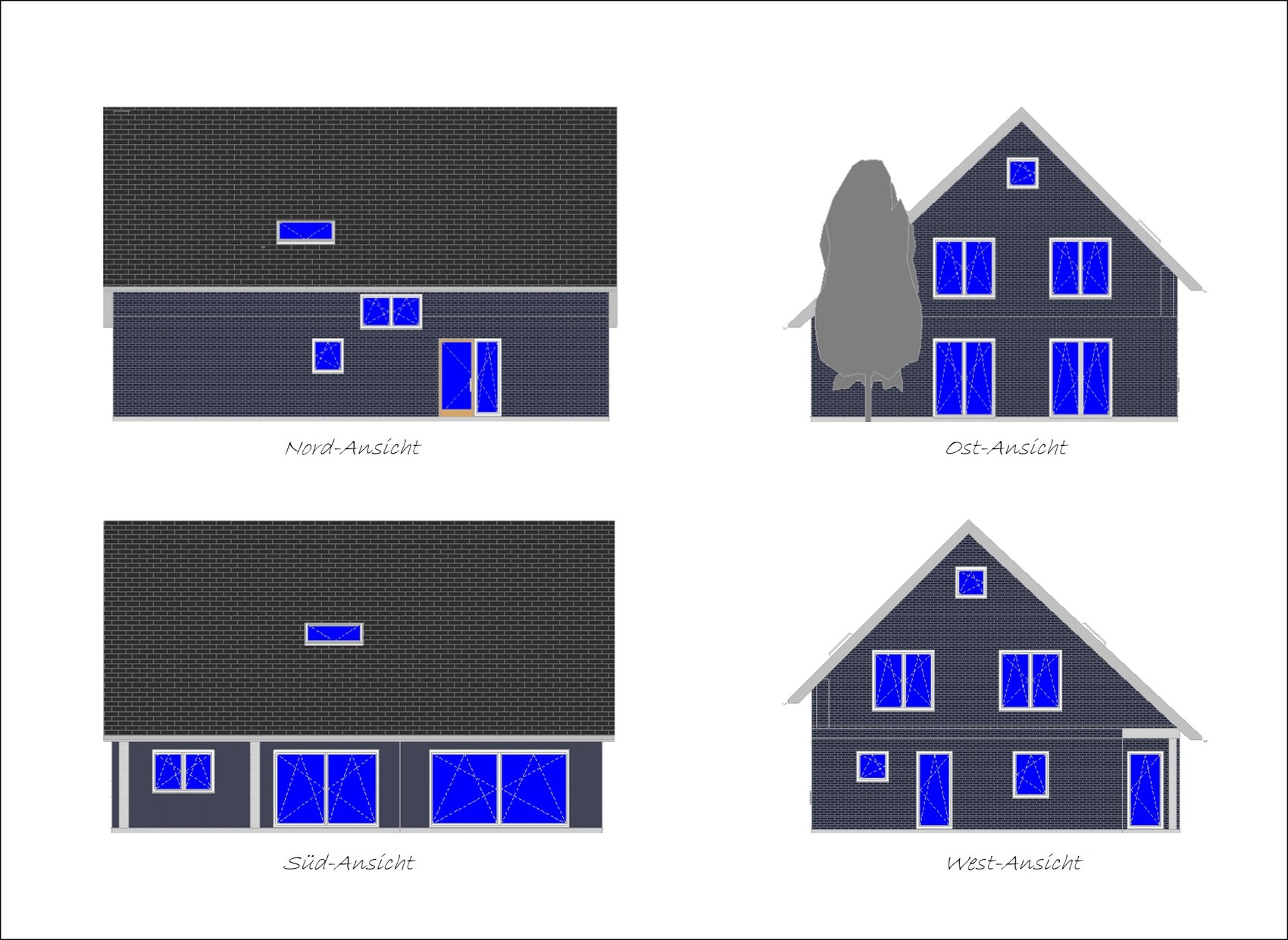 Wir haben uns nun für grau-bläuliche Klinker und anthrazitfarbene Dachziegel entschieden. Die Dachziegel sind auf anraten des Planers nicht glänzend/glasiert. Die Fensterrahmen werden weiß.