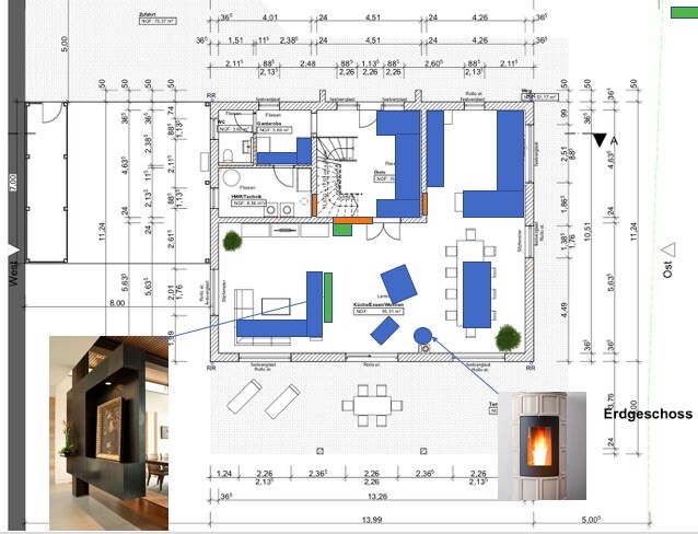 - mittig sollte eine Art Kaminzimmer Platz finden