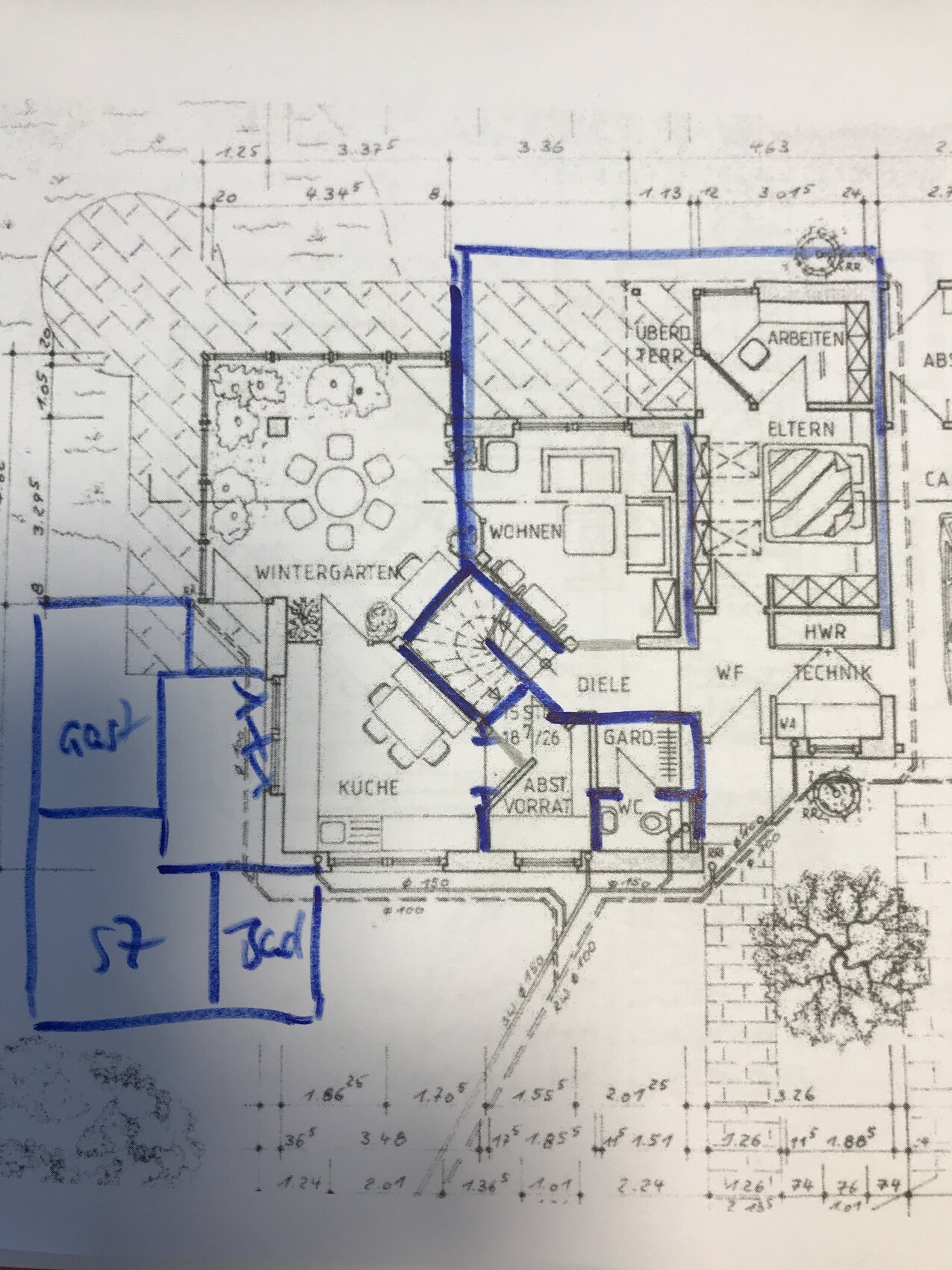 Mit den ca. 55qm ist der Anbau von der Größe schon am möglichen Maximum, das reicht für eine komplett ebenerdige Wohnung nicht aus.Ja, weil ja noch der Anbau für die Eltern on Top kommt.300qm dürft ihr insgesamt überbauen. Das ist nicht wenig... Die Eltern bleiben quasi in ihrer ebenerdigen Größe. Was sie ursprünglich als Anbau „planrechts“ verbrauchten, wird einfach auf anderer Seite angebaut, da ihr für Euch irgendwo ansetzen müsst. Sehe ich das richtig?