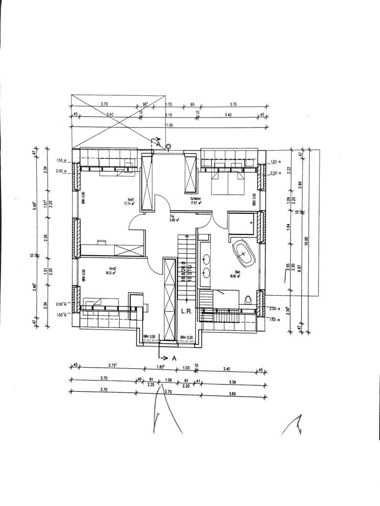 OG: die Kinderzimmer könnten etwas kleiner sein, dafür das Schlafzimmer und Bad etwas größer. Ursprünglich waren beide Kinderzimmer zum Garten hin geplant, dann fehlte aber der direkte Durchgang vom Schlafzimmer ins Bad.