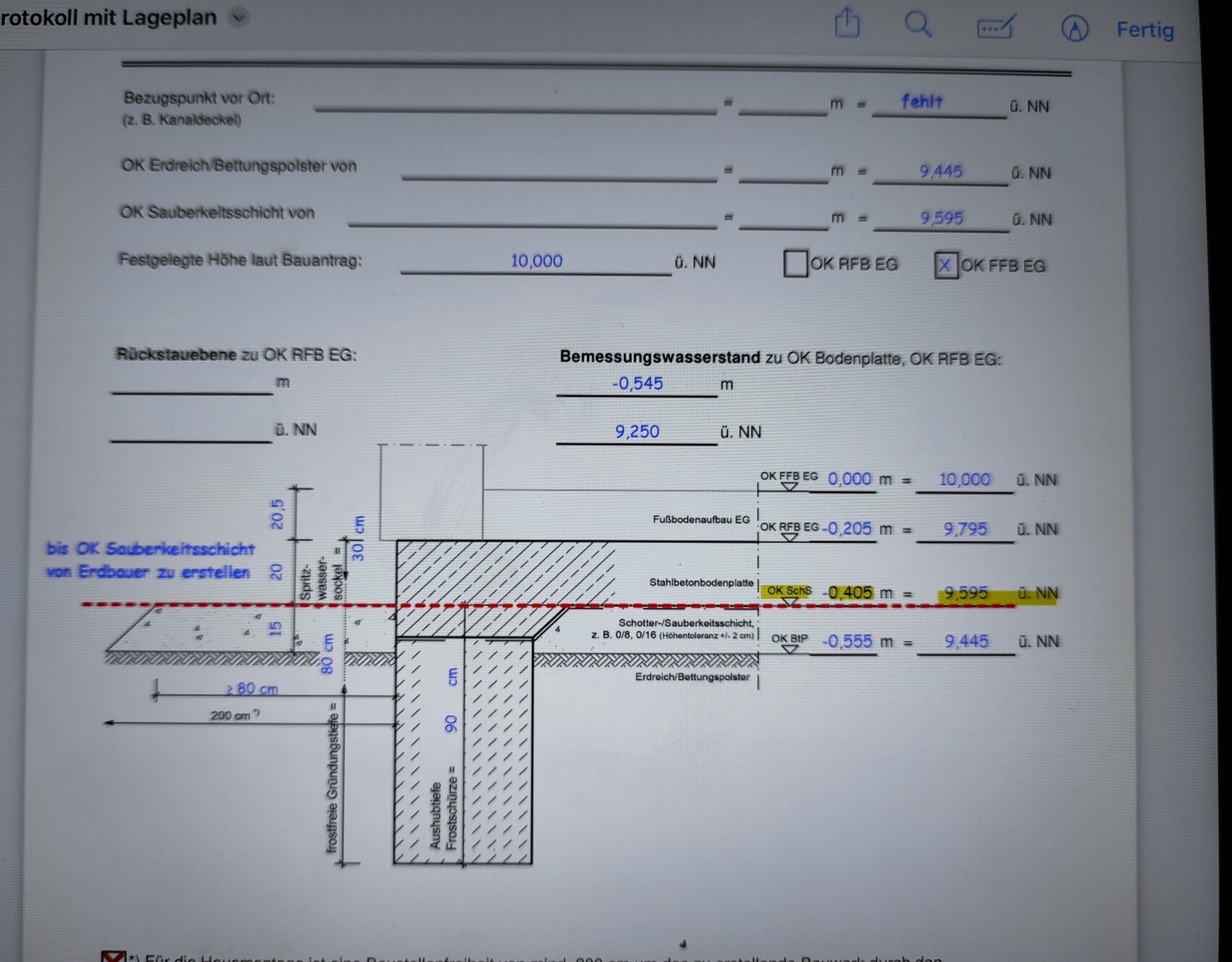 Erdarbeit05.02.23 19:26Vielen Dank für die Antwort! Der Erdbauer wird aus dem Bodengutachten leider nicht schlau, daher hier meine Frage. Der Bauleiter konnte uns leider auch nichts dazu sagen, er koordiniert auch den Erdbauer nicht, das bleibt alles an uns hängen. Wäre gut, wenn wir wüssten, wie viel Erde abgetragen werden soll. Hier noch ein anderes Bild, auf dem der Austauschboden und das Erdreich zu sehen sind. Meiner Meinung nach sind das nur von +9,27m auf +9,50m Austauschboden, so dass nur ca. 23 cm Boden ausgetauscht werden soll, stimmt das so?
