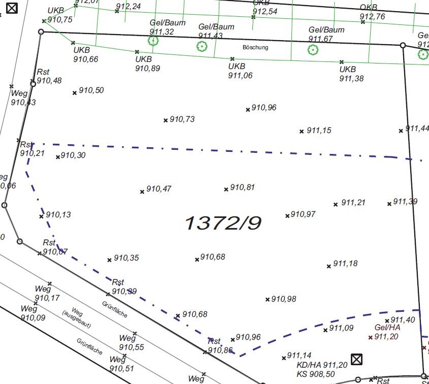Nun war der Vermesser da und hat auf dem Grundstück eine Max. Höhe 911,30 m festgestellt. Im Baufenster beträgt die Max. Höhe 910,95 m.