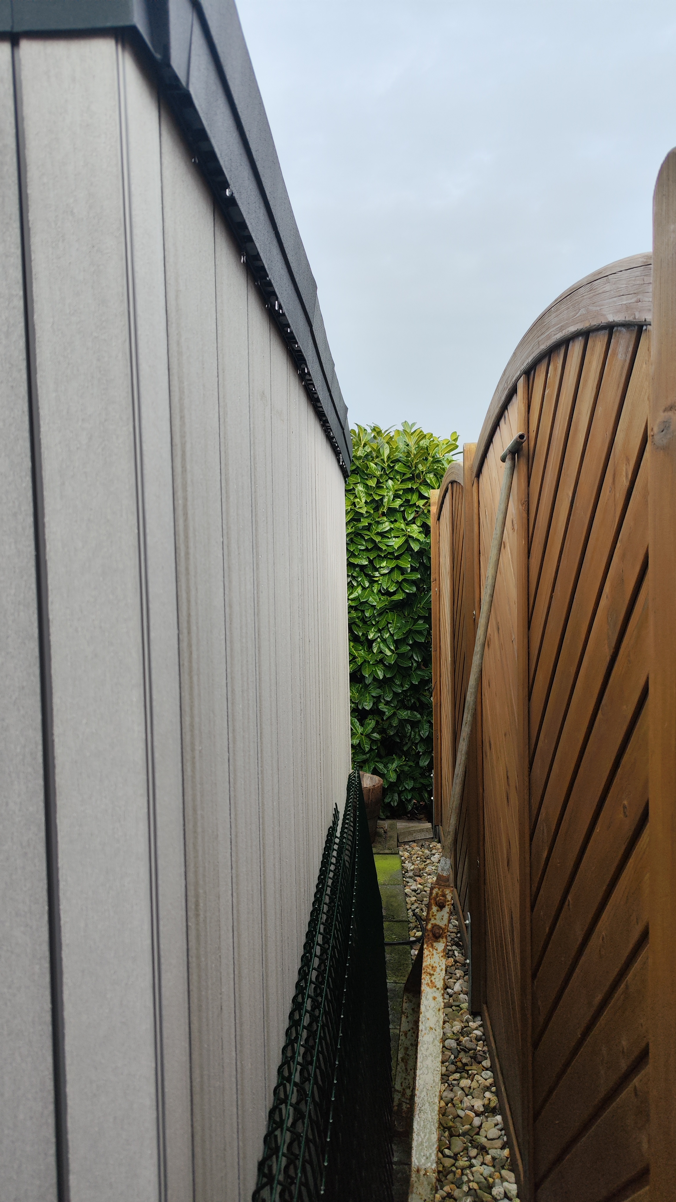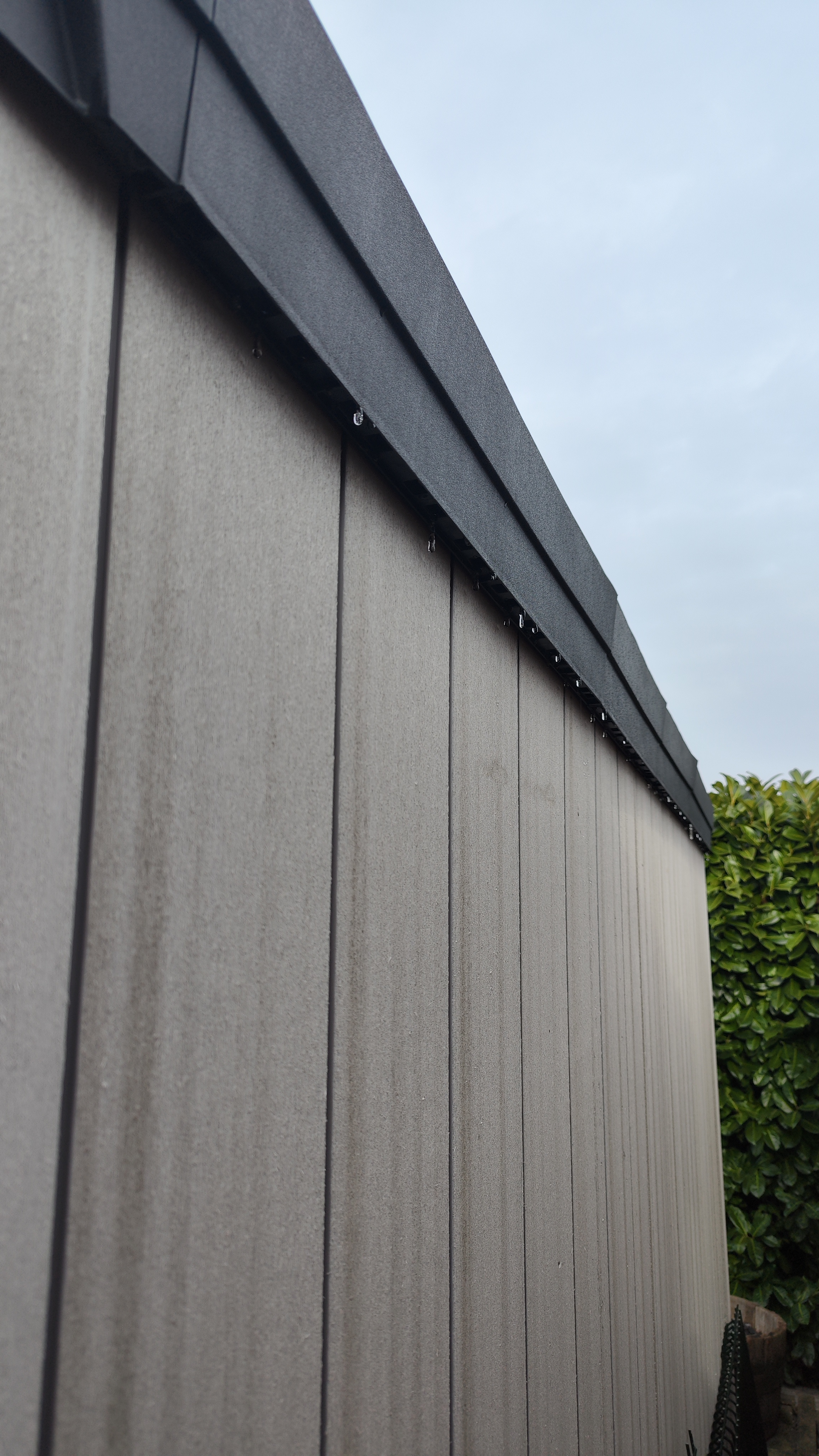 Damit sieht die Rückwand in ein paar Jahren sicherlich nicht mehr top aus. Würde unser Gartenhaus frei stehen, hätten wir auch eine Rinne drangebastelt.