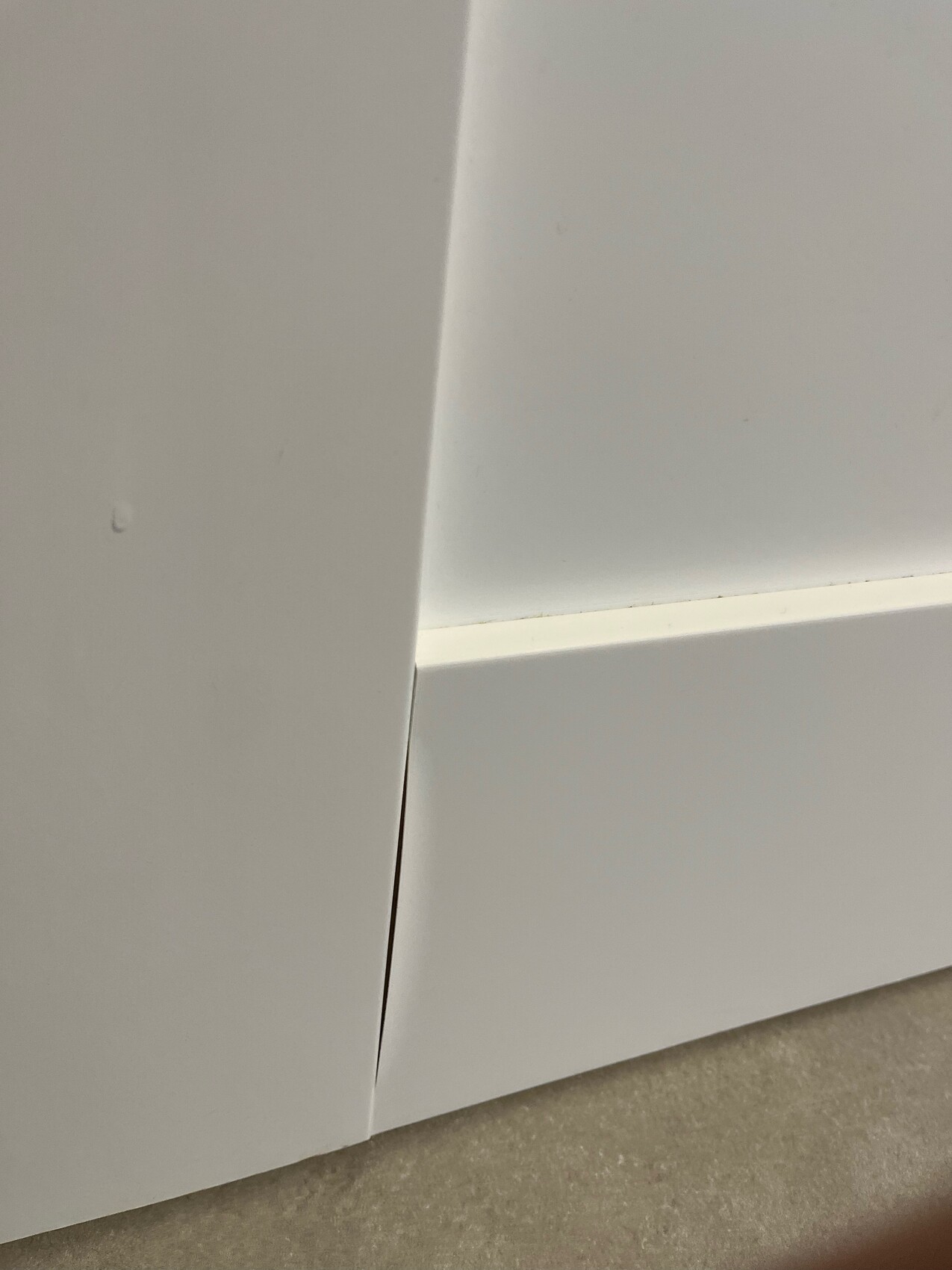 4. Behauptung das die Tür "wellig" sei, was ebenfalls ein Hinweis auf zu viel Feuchtigkeit wäre - Ich habe mit einer langen Wasserwaage die Tür mal überprüft, kein Berg, kein Spalt, kein Bauch, keine Welle, keine Delle.