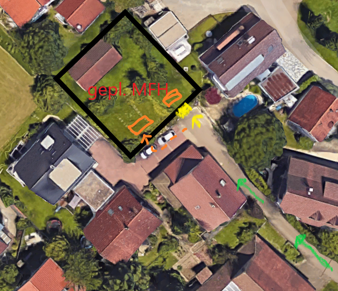 Mottenhausen08.11.19 10:26Fakten schaffen: Dort wo auf dem Luftbild die 2 PKW parken muss schnellstmöglich eine möglichst massive Umfriedung her, samt Bepflanzung und dahinterliegender Grünfläche, ggf. genehmigungsfreier Fahrradschuppen usw. Sodass vor Ort sich gar nicht mehr die Frage der Zufahrt über euren Hof stellt. Durchfahrt zu den hinteren Häusern dann nur zwischen Haus und neuer Grünanlage.