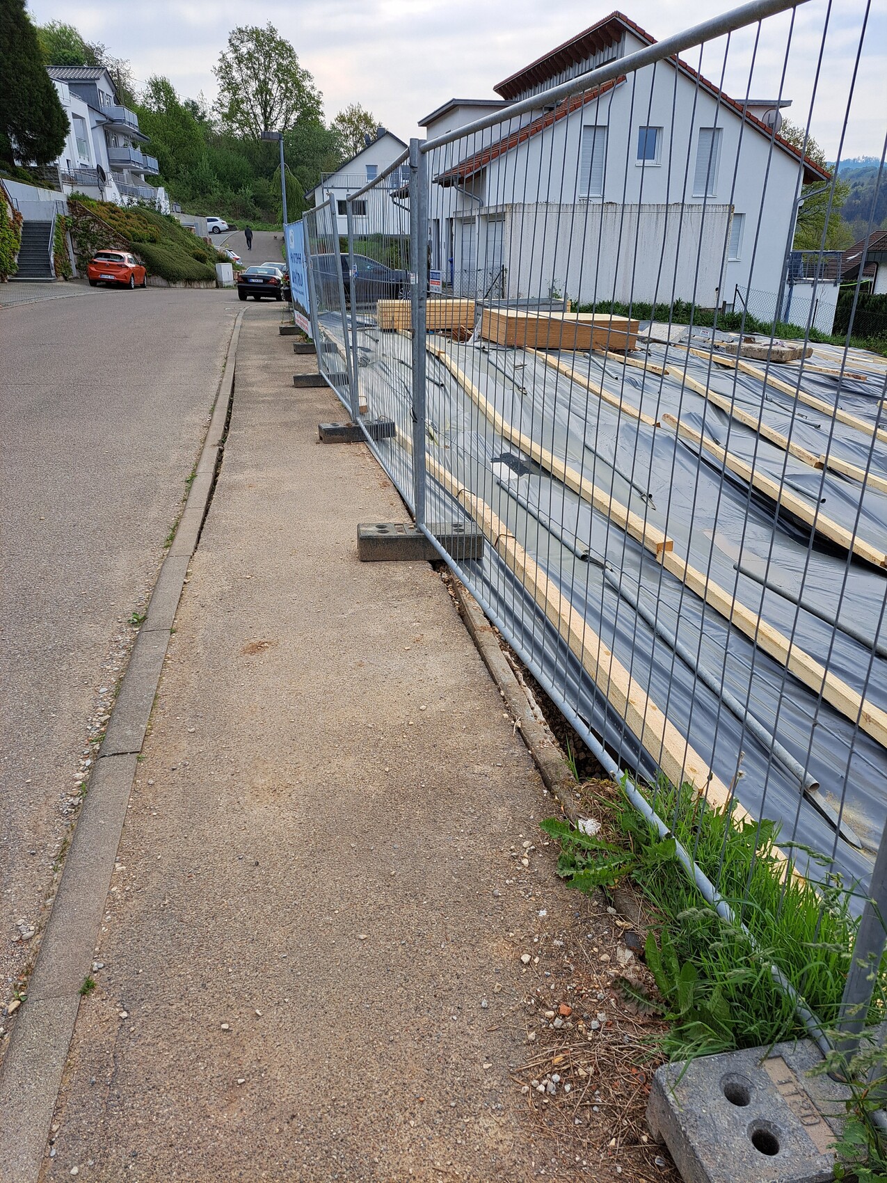Oben wurde ein großer Bereich mit Planen abgedeckt, vermutlich da sich der Gehweh oben bereits abgesenkt hat und kein weiteres Wasser großflächig in das Erdreich dringen soll.