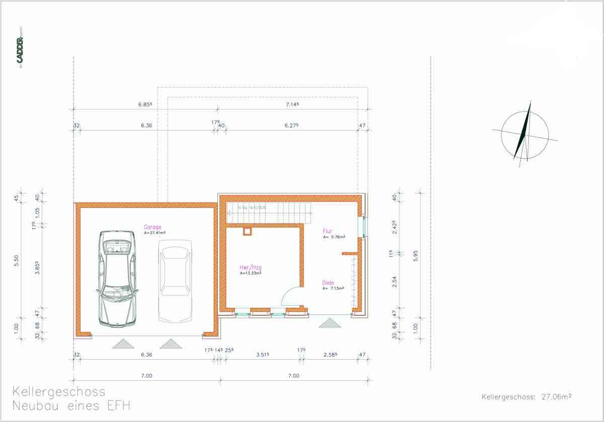Grundriss Kellergeschoss eines Einfamilienhauses mit Garage, Flur und Diele