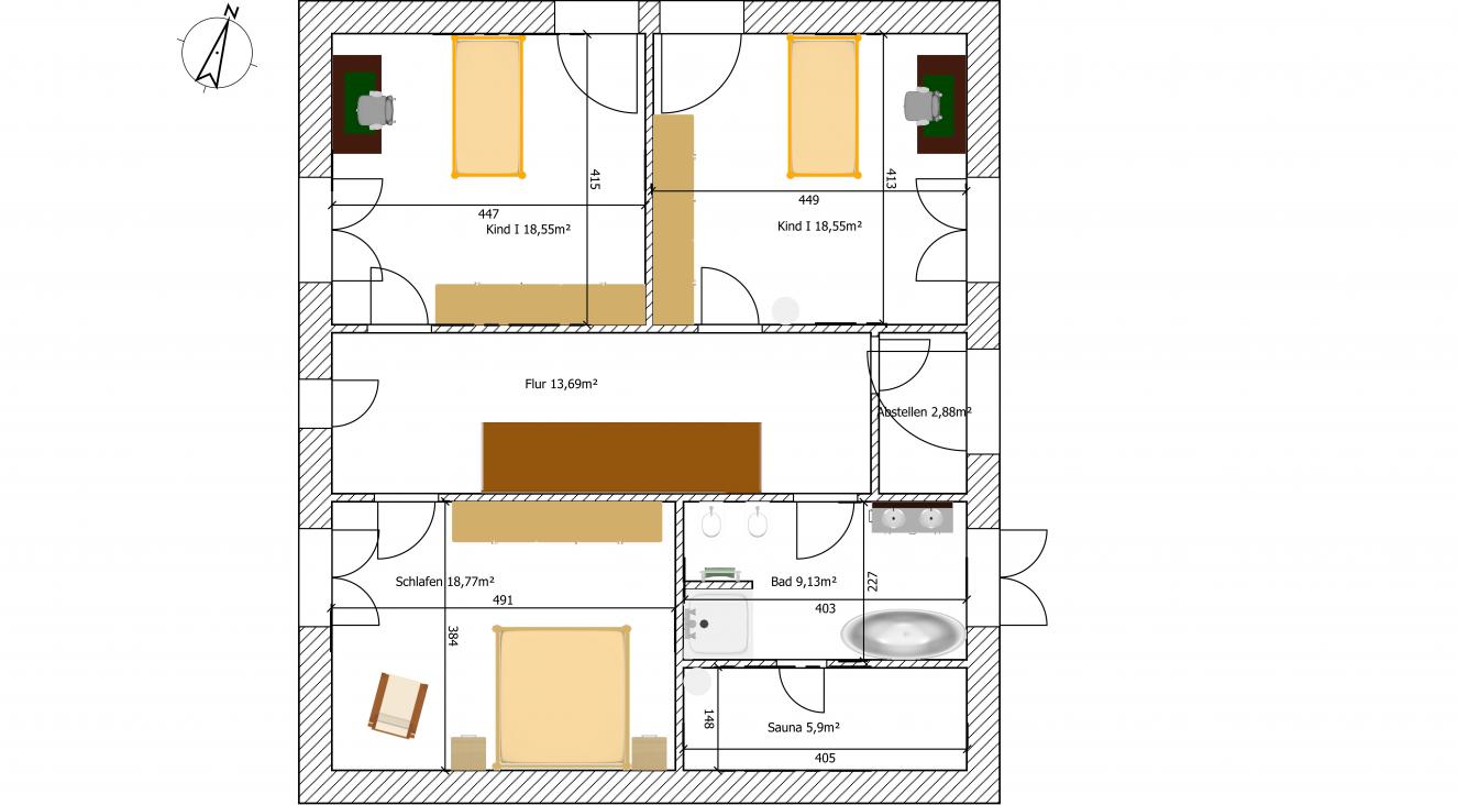 An der Ausrichtung ist leider nicht viel zu machen. Es ist nun mal ein Nordgrundstück. Wobei die Kinderzimmer haben Freunde von uns sehr ähnlich und auf Grund der großen Fenster und de Gaube ist es überhaupt nicht dunkel. Unser Büro in der Wohnung jetzt ist auch Nord-West und hat zwei große bodentiefe Fenster und es ist gar nicht dunkel. Richtige Südzimmer haben wir ja nicht, da die Firstausrichtung Süd-Nord ist. Naja, un das Wohnzimmer Richtung Süden macht halt keinen Sinn. Was sollen wir denn auch die ganze Zeit auf die Straße gucken, bei dem schönen Garten. 🙂
