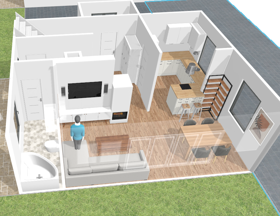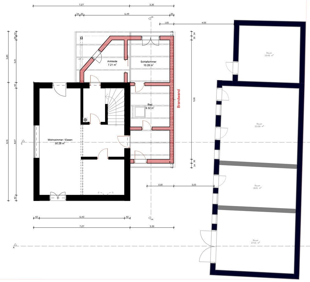 Parallel dazu habe ich eine erste Planung für den Anbau erstellt, welche als Entwurf mit dem Bauamt durchgesprochen wurde. Dank kurzer Dienstwege wurde mir binnen wenigen Tagen eine vorerst mündliche Zusage für einen Anbau erteilt, unter besonderer Beachtung des Brandschutzes. Hier ergab sich schließlich die Entscheidung das bestehende Bad vom alten Haus in den Anbau zu verlagern und im OG ein Kinder-/Gästebad auszubauen. Entsprechend wurde das Wohnzimmer deutlich größer und bietet einen direkten Zugang zur Terrasse. Geplant ist der Anbau in 3 Jahren, im selben Zug wird das bestehende Haus gedämmt.