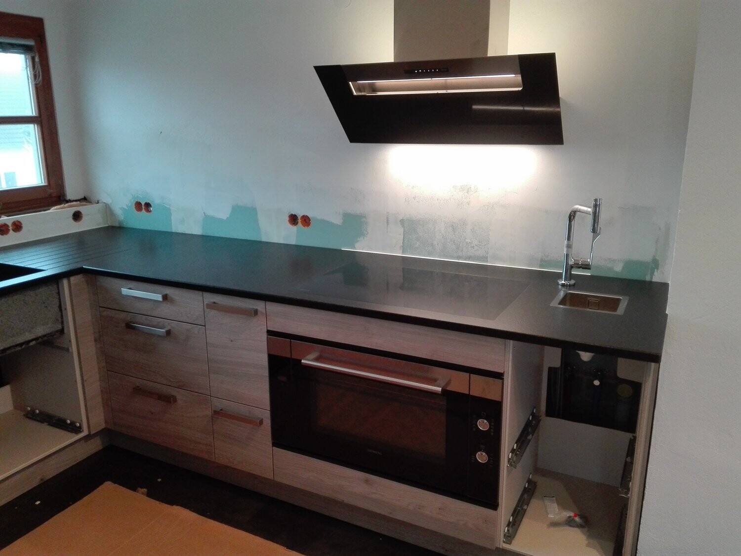 Obwohl wir keine Insel haben ist der Abstand zwischen Hauptspüle und Kochfeld recht groß. Mit dem extra Auszugs-Hahn kann ich jetzt auf jeder Kochstelle Wasser direkt in den Topf nachfüllen. Muss ich schnell die Hände Waschen (weil ich wieder mal im Essen rumgepatscht habe), ist der Weg zum Abwaschen ca. gleich null Meter. Und wenn ich schnell was abgießen will, steht keiner zwischen 10 Liter kochenden Wasser und dem Becken.
