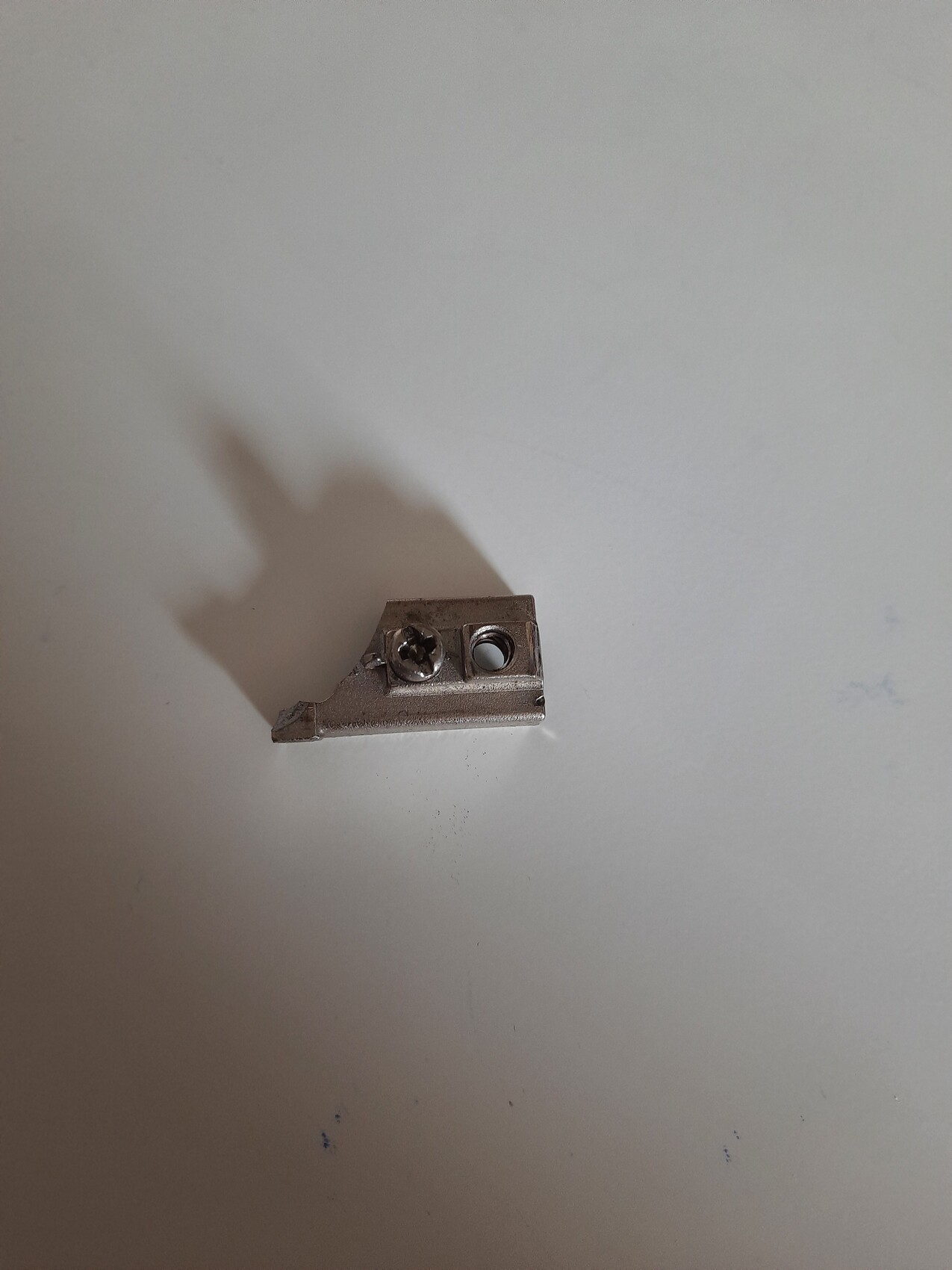 Kleines metallisches Montagesteil mit Schraube und zwei Bohrungen auf heller Oberfläche.