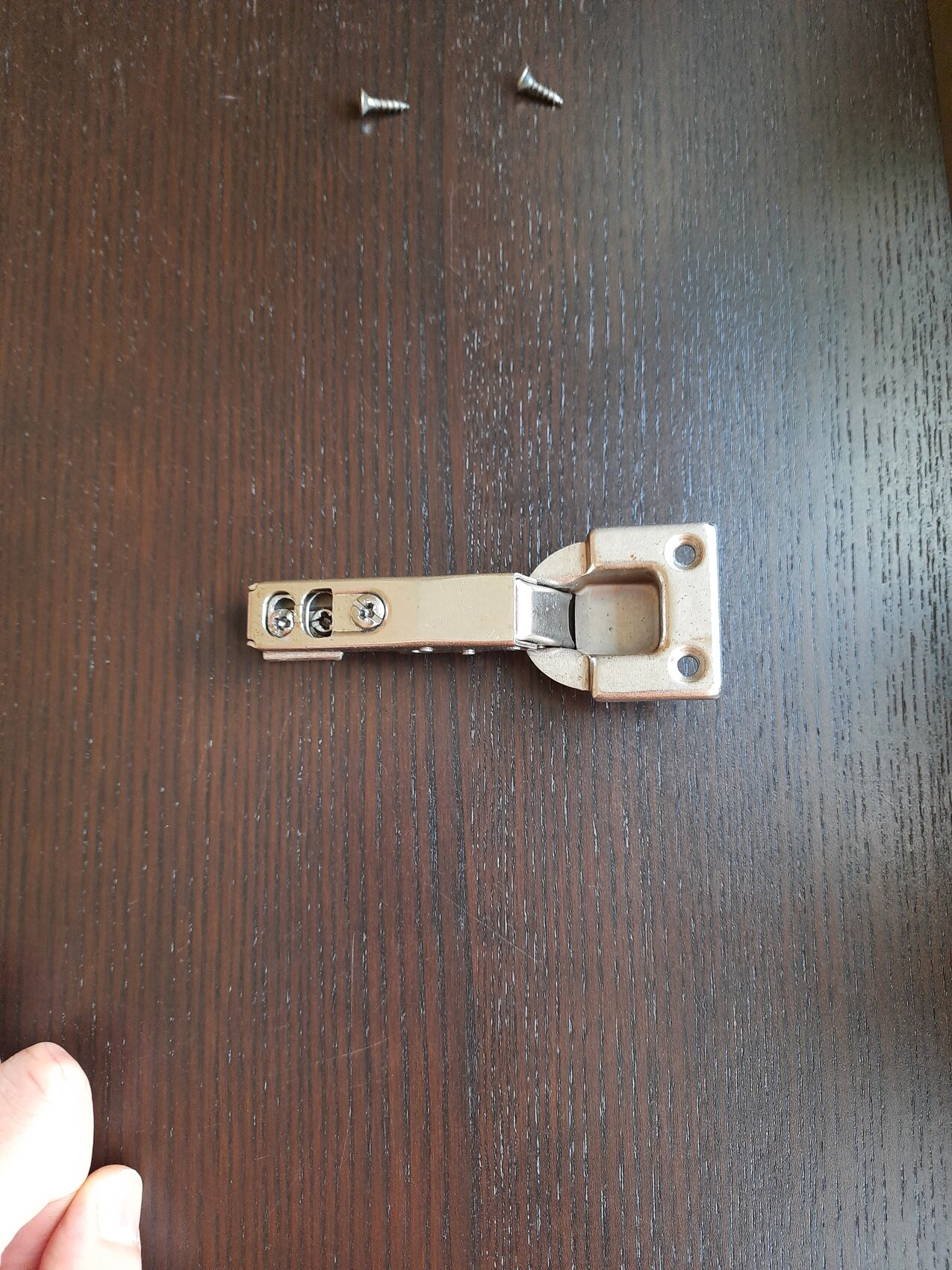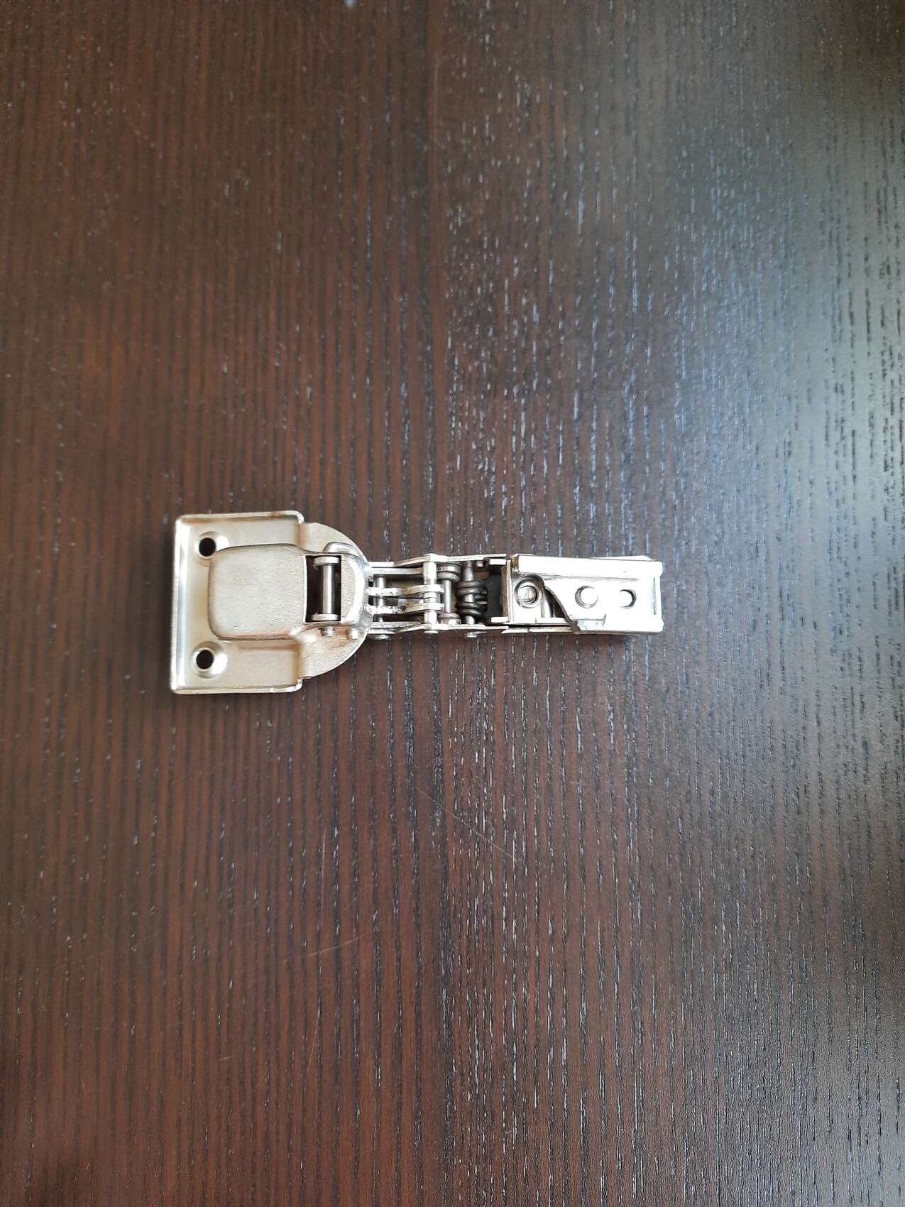 Kleines Metall-Scharnier-Bauteil liegt flach auf dunklem Holztisch; zwei Schrauben sichtbar.