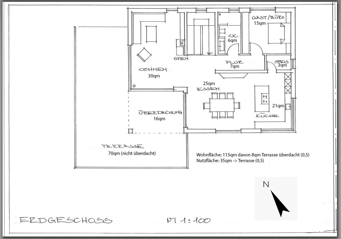Die Größe der Terrasse finde ich auch zu groß. 11ant hat das ganz gut beschrieben. Aber die Räume im UG sind jetzt unserer Meinung nicht so groß (außer der Flur). Wir haben überlegt ob man das Wohnzimmer nicht noch etwas Richtung Terrasse rauszieht, dass nur noch ein kleinerer "Weg" zum Garten führt. Und dafür noch das Schlafzimmer ins EG legt. Aber dann müsste das WC auch vergrößert werden... Oder wird das dann alles zu eng?