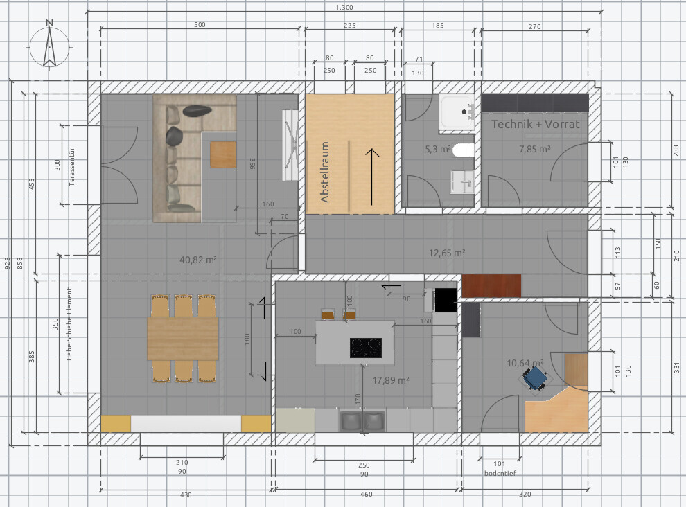 Hängt Ihr an der geraden Treppe oder wäre auch gewendelt eine alternative Option?Stimmt, die Garderobe wäre da hinten zu weit weg. Man könnte aber eine ungefähr 1,50 m x 1,00 m große Ecke aus dem Technikraum rausnehmen, sodass direkt rechts am Eingang eine Garderobe entstehen kann.