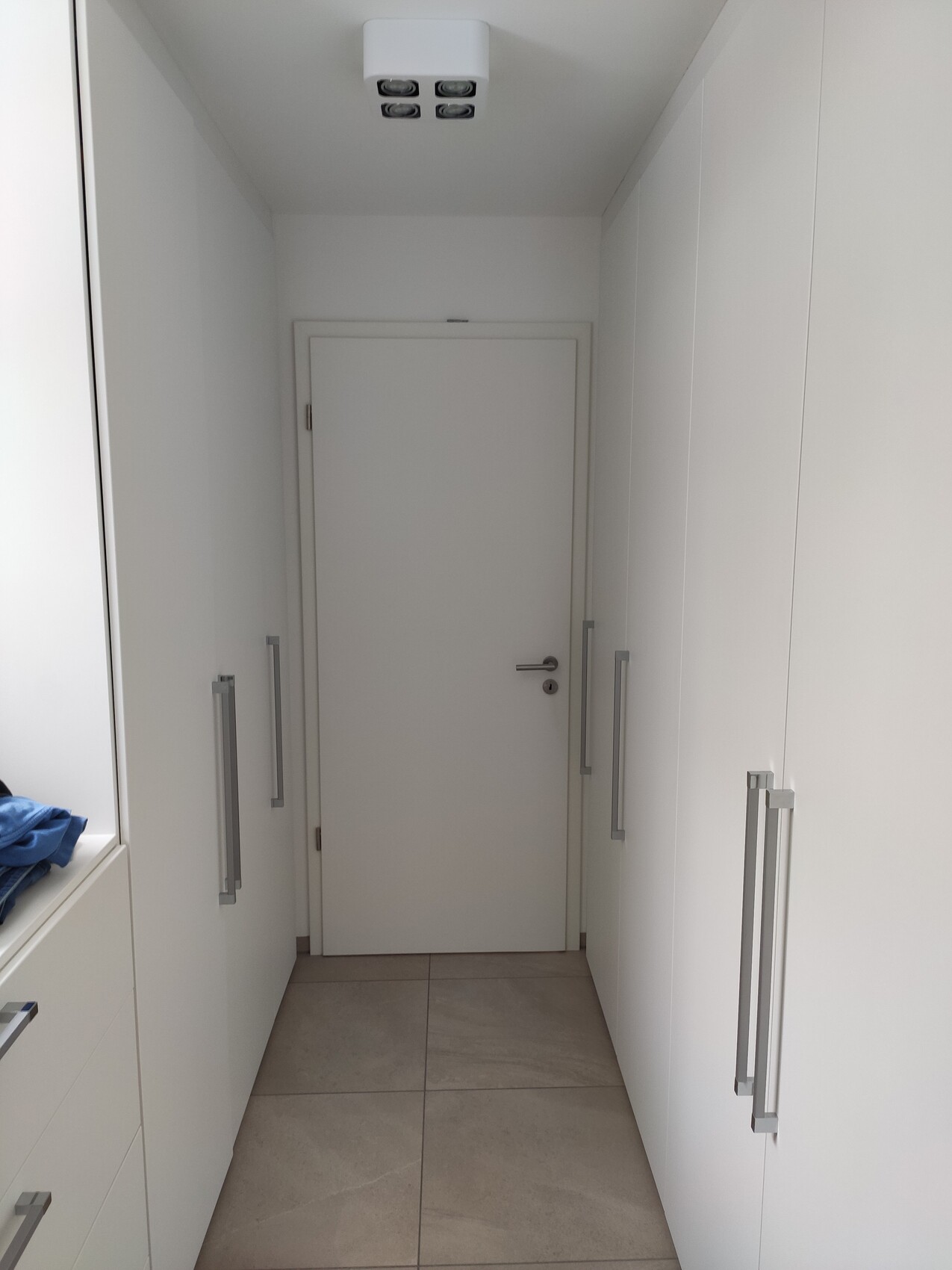 Weißer Flur mit beidseitigen Einbauschränken, Tür am Ende, moderne Deckenleuchte.