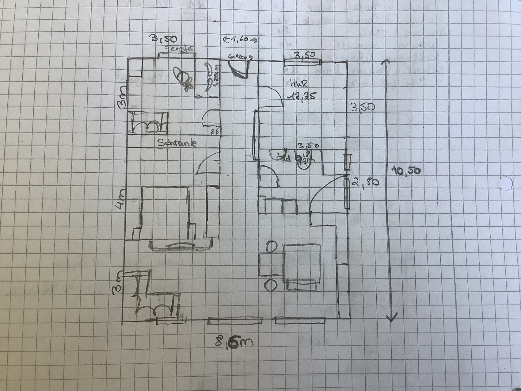 Handgezeichneter Grundriss eines Wohnraums mit Türen, Möbeln und Maßen auf kariertem Papier.