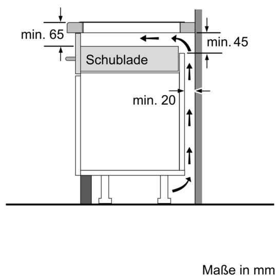 Für unser Wunsch-Induktionsfeld (Siemens EH845SP17E) ist eine Eindringtiefe von 53mm gefordert, für die Luftzirkulation insgesamt eine Höhe von min. 65mm von Oberkante Arbeitsplatte zu Schublade.