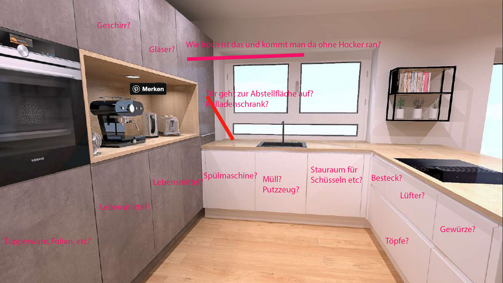 Ich habe meine Vorräte an Kaffee, Mehl, Zucker, Backzeug, Honig, Marmelade, Nudeln) und mein viel genutztes Geschirr (Tassen, Gläser, Schüsseln) gerne in gut erreichbaren Höhen. Davon gibt es in dieser Küchenplanung aber nicht viel. Und Ihr habt noch keine Kinder, plant aber laut Hausgrundriss welche ein - es kommt noch ganz schön viel an Krempel für Babies und Kinder dazu. Auf Arbeitsflächen und in den Schränken.
