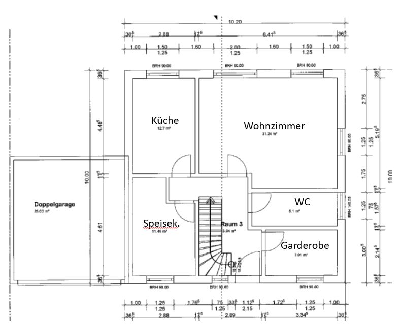Das Wanddetail Garage / Haus ist hoffentlich nicht ernst gemeint. Die Speisekammer reicht für zwei Jahreslieferungen vom Bofrostmann auf einen Schlag. Dafür ist die Küche zu spärlich bemessen, um dort auch zu essen - der Weg zum Servieren im Wohnbereich jedoch eine Pilgerreise.