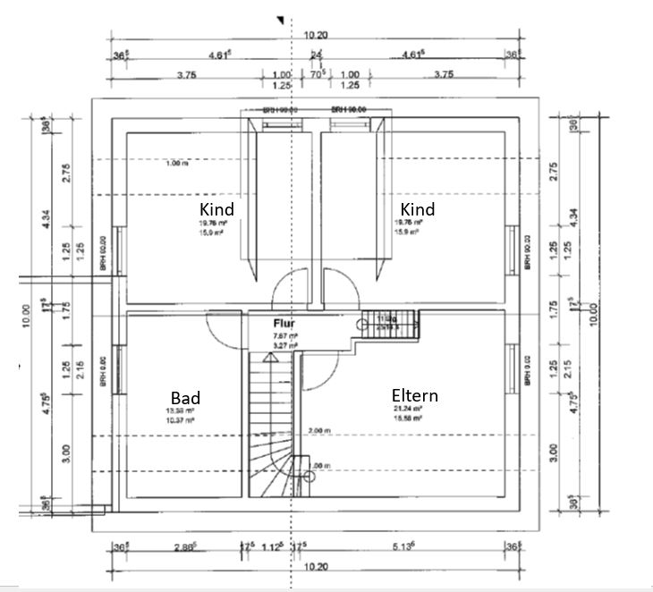 Die 20 cm mehr ggü. dem alten Plan hätte ich lieber der Tiefe als der Breite zugeschlagen, dann hätte man ohne den Treppenaustritt zu beschneiden die Mittelwand in allen Geschossen sauber unter die Firstpfette stellen können.