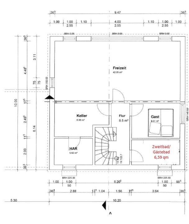 Wir haben es hier mit dem Modell "08/15 Zehnmalzehn" des Bauunternehmers zu tun. Bewährt seit 1948, dann 1964 von 24 auf 30 und 1980 von 30 auf 36,5 cm Außenwandstärke upgegradet, inzwischen hundertfach in diversen Dachneigungen und beiden Firstrichtungen gebaut. Bei Gefälle in der Gegenrichtung auch schon mit Einzelgarage im Keller. Mit Öltank, mit Weinkeller, in weiß oder milchkaffeegrau. Und in der aktuellen Variante steht endlich einmal nicht "Hobbykeller" in der hinteren Hälfte der Kellerfläche.