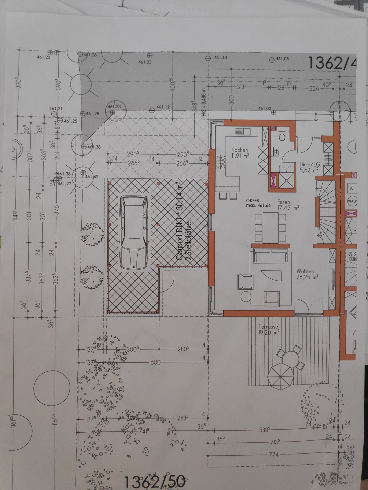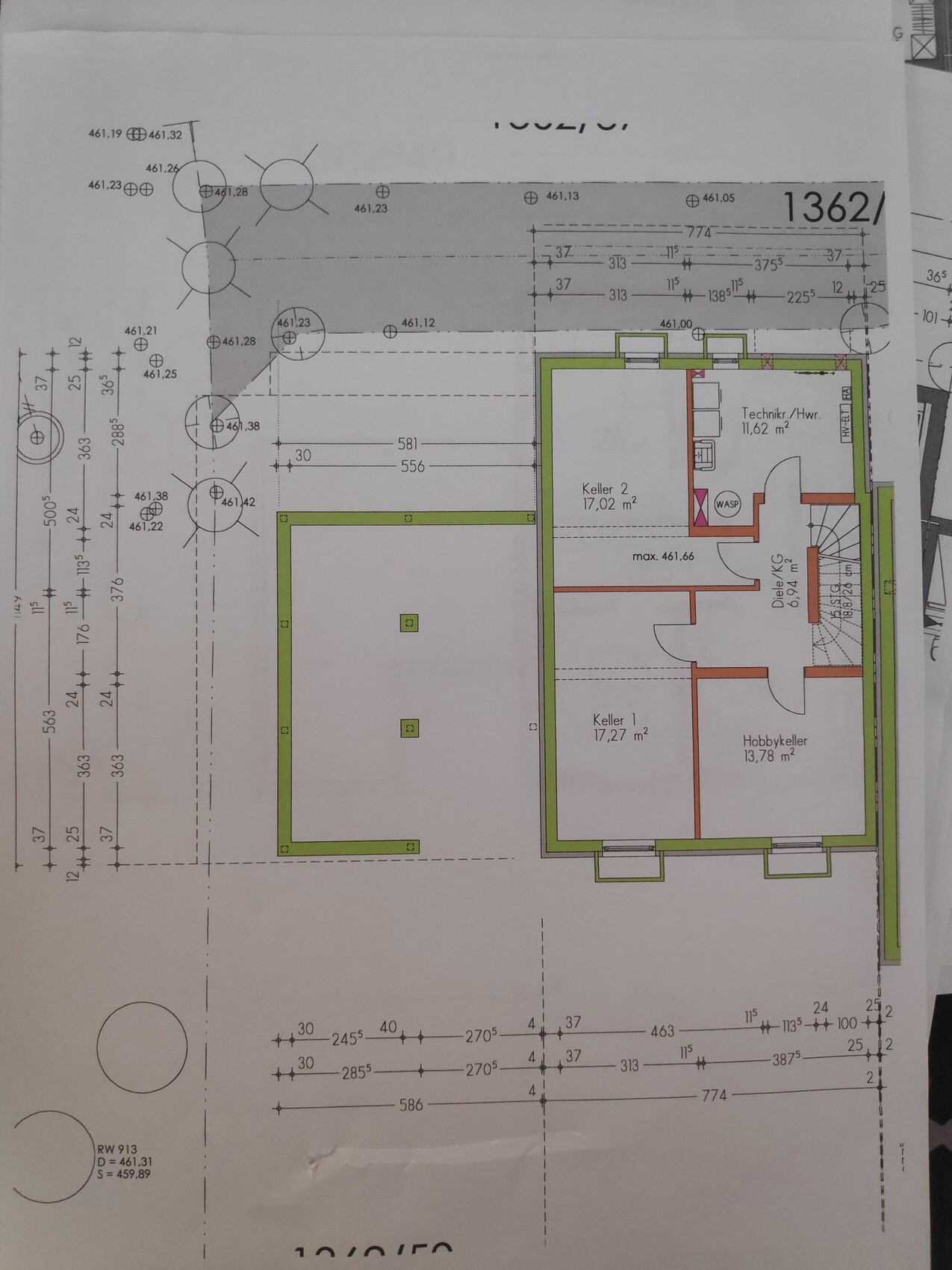 Ich würde wohl dieses Quadrat zw AB draußen und SW-Ecke Haus untergraben/Abböschen und dort dann im Keller ein schönes wohngerechtes Fenster machen, dann könnte unten ein Aufenthaltsraum entstehen. Soll denn der Keller beheizbar werden? Welche Deckenhöhe ist geplant?Mit "Kasematten" sind die "Fenster" bzw Schächte gemeint nehme ich an. Sehr guter Punkt der uns bisher gar nicht aufgefallen war. Die Lösung mit der Abböschung klingt gut, damit wäre zumindest für den einen Raum das Thema geklärt. Gedacht war das die beiden südlichen Räume "Keller 1" und Hobbykeller beheizt sind. Raumhöhe 2,45 m (siehe Bilder unten).Maße überall wären schon sehr hilfreich. Ist etwas wie Rätselraten Habe die Pläne mal mit etwas mehr Abstand fotografiert, so dass die Maße hoffentlich erkennbar sind. KG: