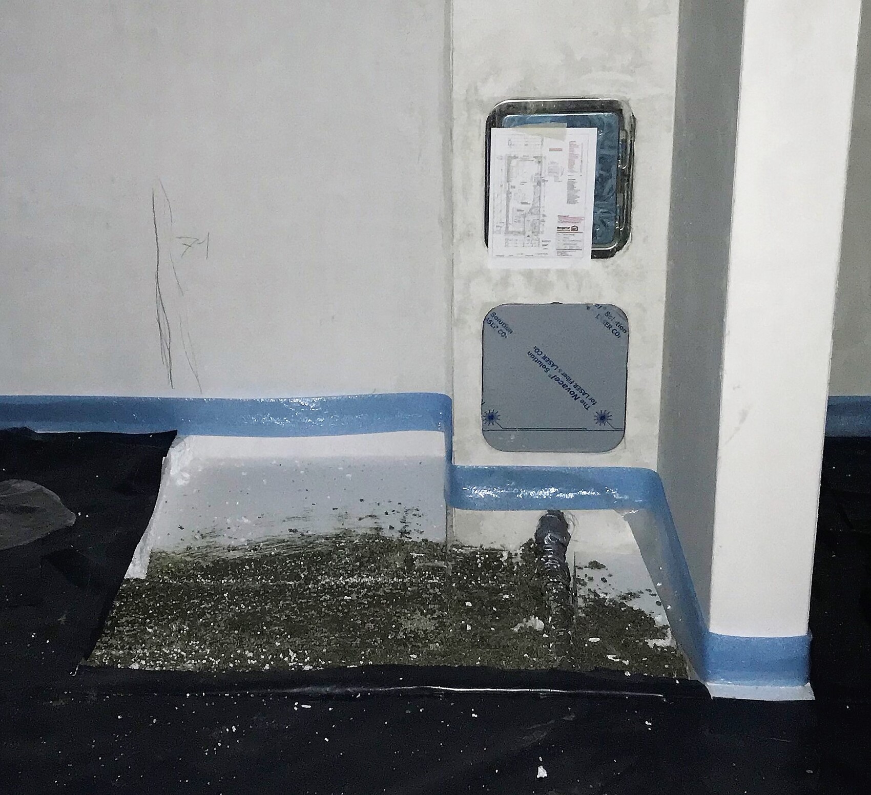 Betonwand im Rohbaukeller mit blauem Bodenschutzrand und Installationskasten