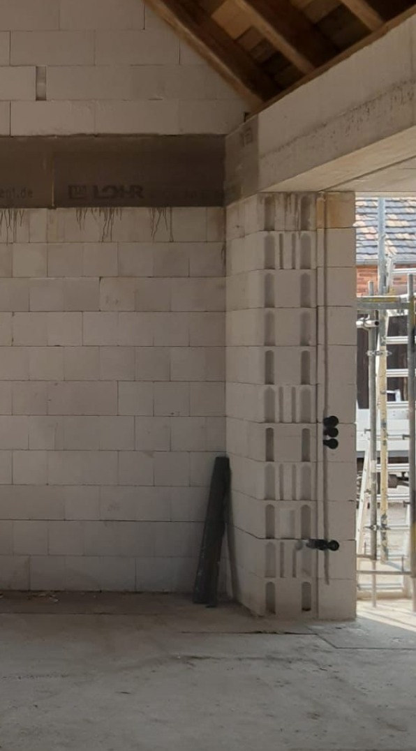 Für den Ringanker nicht. Es handelt sich um 36,5er Kalksandstein und der war nur nötig, weil die KFW uns damit in Bereichen, in denen wir altes Dreifachmauerwerk um neues ergänzen, beauflagt hat. Es wird ein KfW55-EE-Haus. Ein dünnerer Stein hätte sonst auch gereicht. Wir bekommen dadurch mit Dämmung und Verblendmauerwerk letztendlich ziemlich dicke Wände.