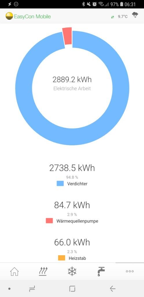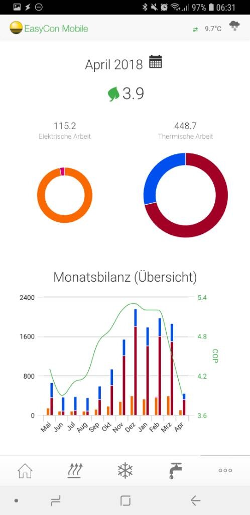 Kfw50, 120m2, Fußbodenheizung (keine Absenkung oder sonstige "Optimierung"), Erdwärme (Tiefenbohrung), Werte für Heizen/Kühlen und Warmwasser. Temperatur überall 22-23°.