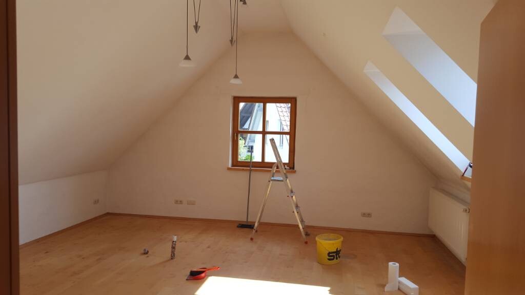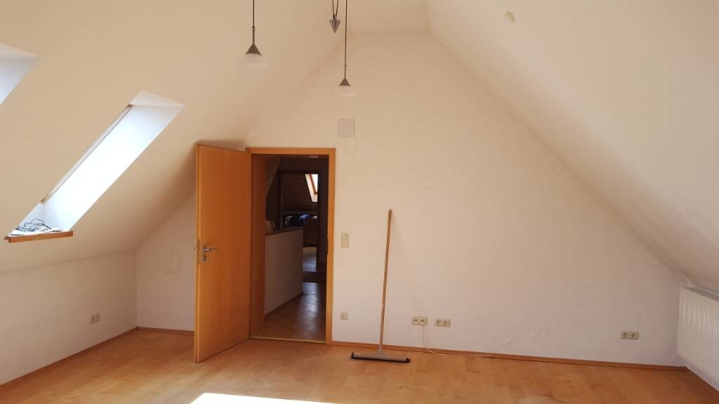Wie ihr seht, hat der Raum an zwei Seiten eine Dachschräge und eine sehr hohe Decke.