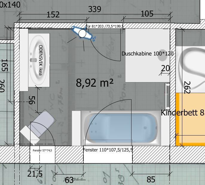 Die Wand ganz an die Wanne, bis auf Höhe der Fensterbrüstung und neben dem WC noch ein Urinal.