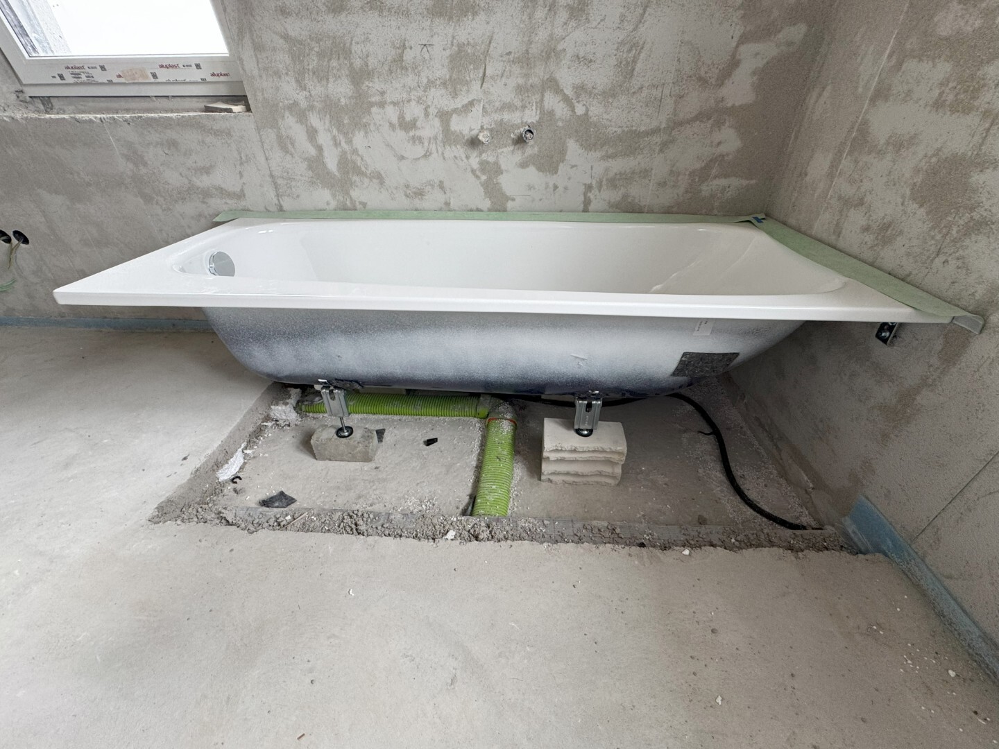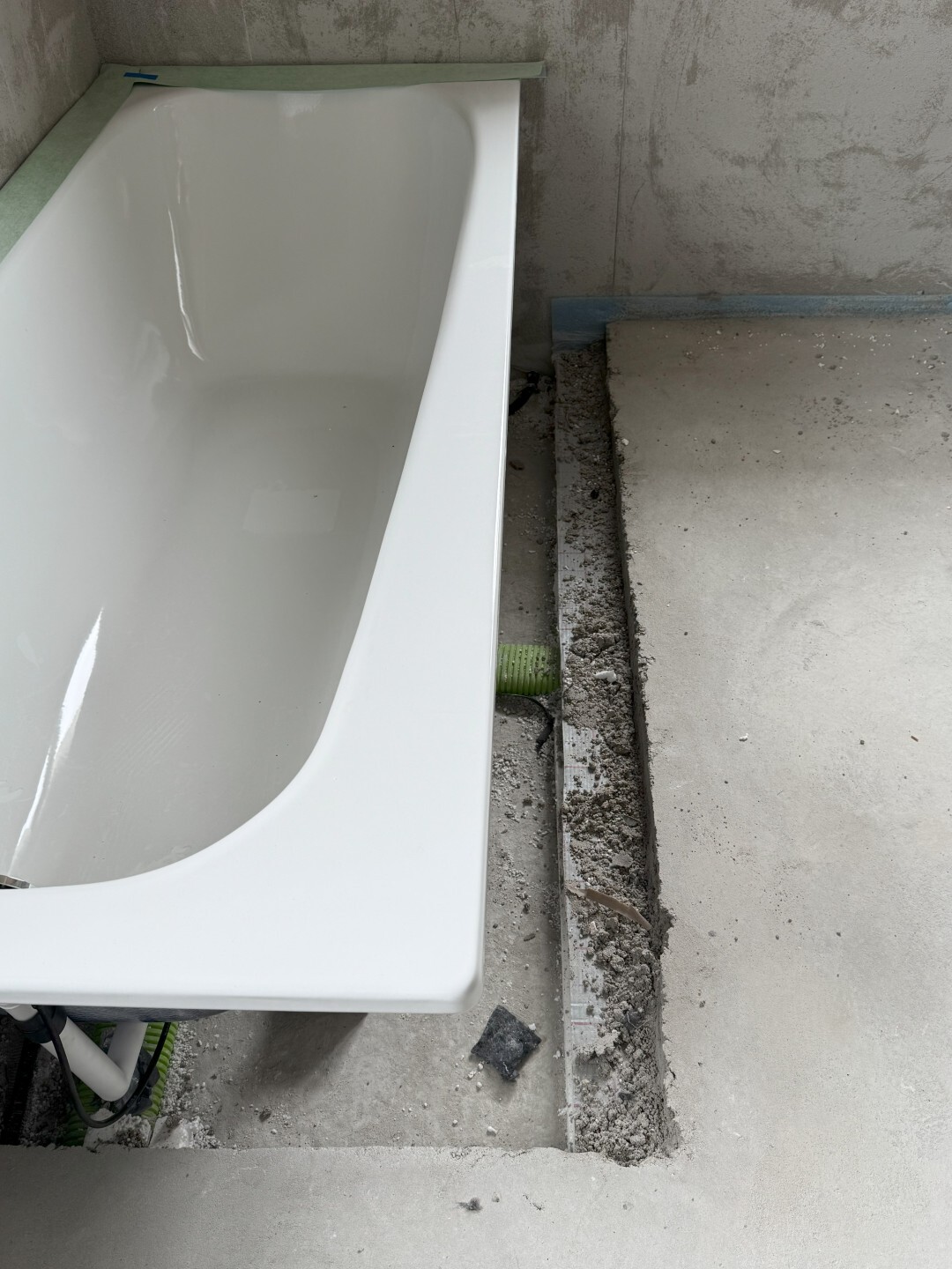 Die Baufirma hat leider auch den Estrichausschnitt willkürlich vorgenommen, am kurzen Ende steht der Estrich unter der Badewanne, am langen Ende ist er zu kurz. Das versucht man nun aktuell auf den Fliesenleger zu verlagern.