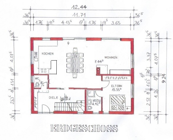 Weil hier so oft das Thema "zu große Diele" angesprochen wurde habe ich mal den eingestellten Entwurf etwas angepasst mit einer kleineren Diele und dafür einem größeren Essbereich. In dem neu gewonnen Stück können auch gut größere Schränke stehen (Spiele etc.). Zugang zum Elternschlafzimmer wäre dann allerdings über den Essbereich. Den Esstisch habe ich auch mal mit 10 Stühlen bestückt.