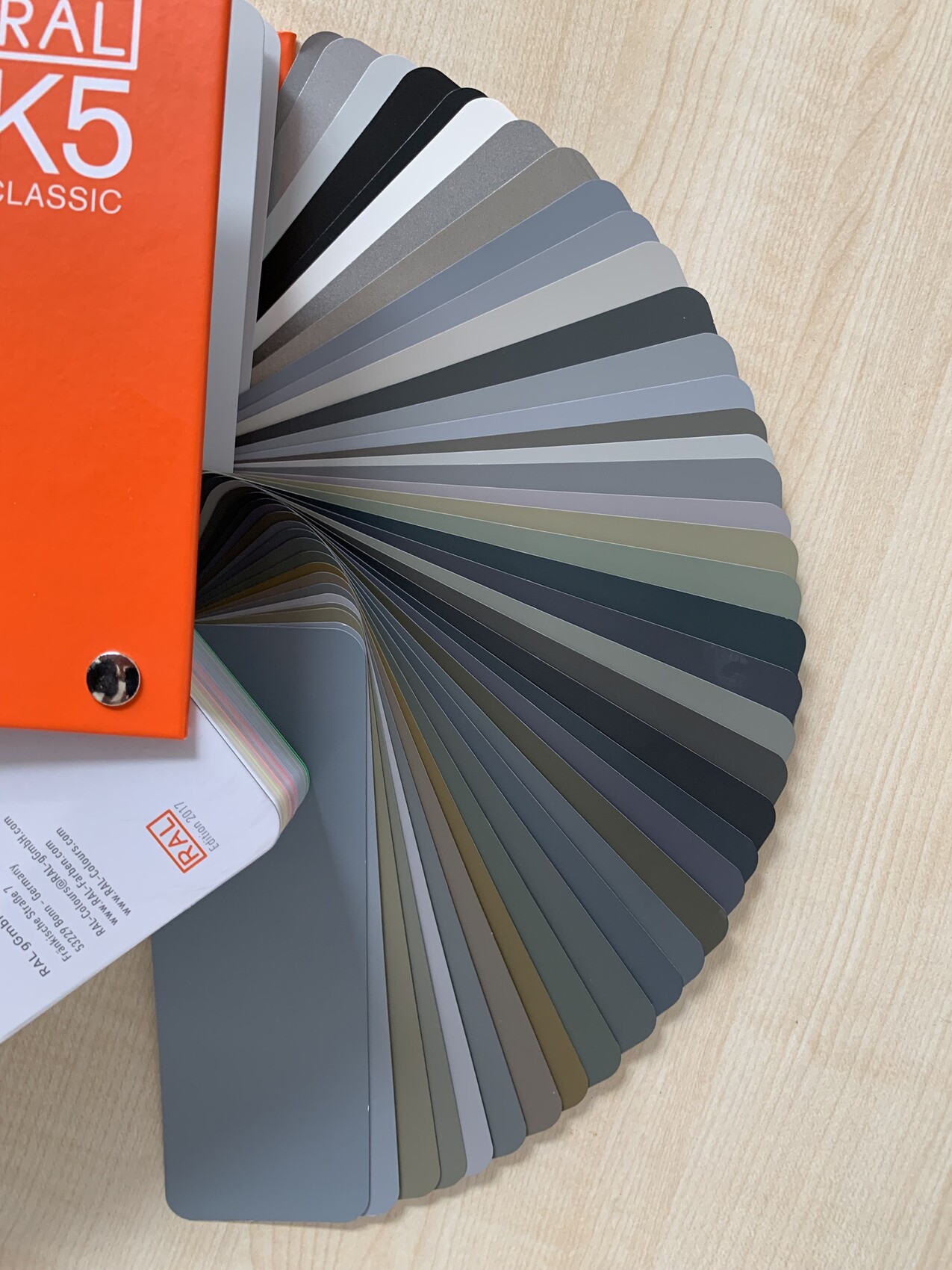 Mein Foto zeigt einen K5 Farbfächer. Kleiner würde ich nicht gehen, das hilft irgendwann nicht mehr. Wenn man einen "Lieblingsfarbton" heraus gefunden haben sollte, kann man den auch einzeln als größere Karte kaufen und gegen alle anderen Muster anhalten um zu gucken, ob das passt.