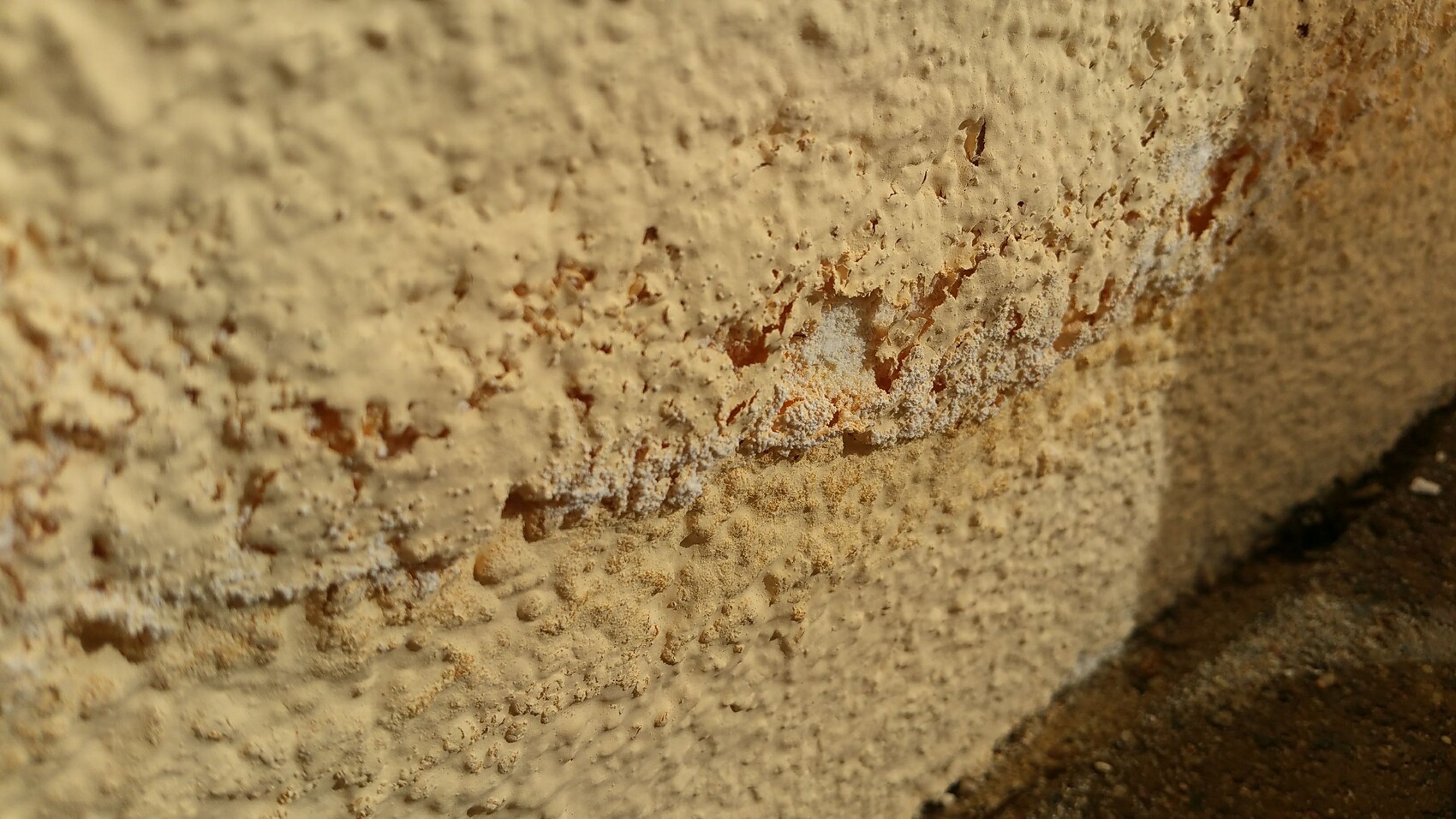 Nahaufnahme einer rauen, abgeplatzten Putzwand mit weißer Kruste und Bodenrand.