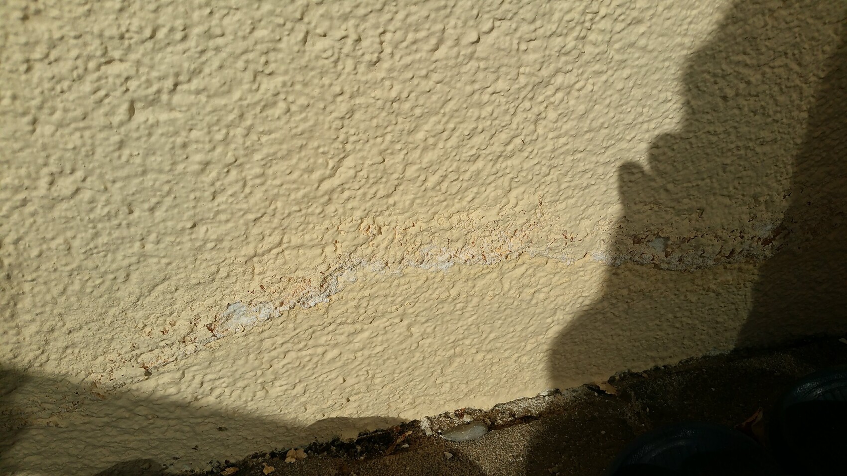 Beige verputzte Wand mit einer unteren Risslinie; Schatten einer Person rechts; Boden mit Kies.