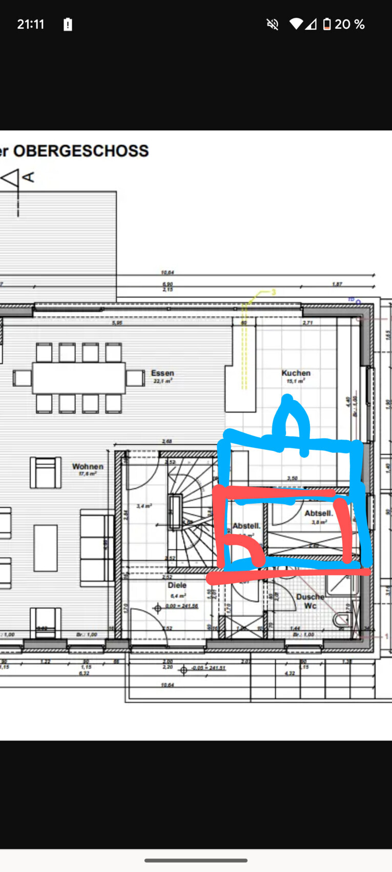 Die 2 Abstellkammern finde ich zu kompliziert gedacht. Wie wäre es eine Abstellkammer als Küchenschränke auszuführen... Können ja teilweise begehbar sei. Den Platz in der Küche braucht ihr da ja nicht. Und die andere Abstellkammer als Zimmer. Das kann ja dann Abstellkammer, Büro, Gästezimmer etc. alles sein.