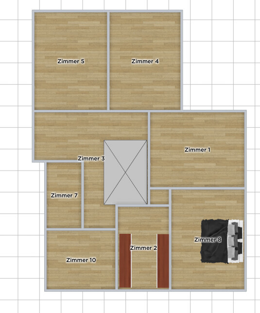Das OG wäre mit Fenster über der Eingangstür. Zimmer 1,4 und 5 sind SO eingerückt, also kleiner als EG