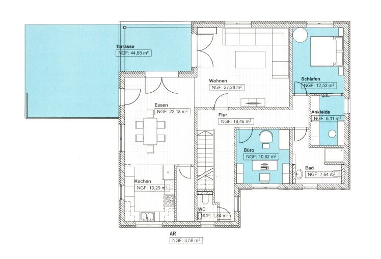 Und Bürotür könnte an die andere Wand gleich „neben“ die WC-Tür.