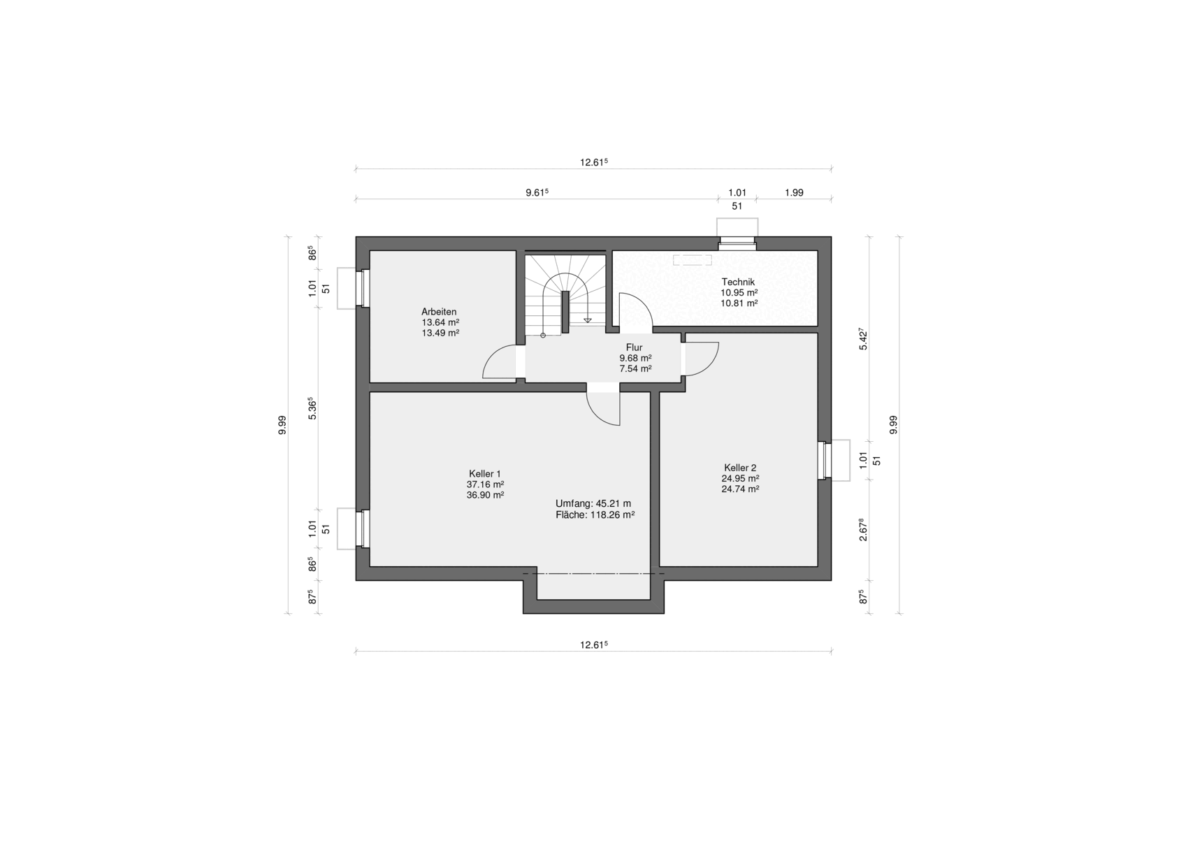 Grundriss Kellergeschoss mit Arbeiten, Keller 1, Keller 2, Technik und Flur.
