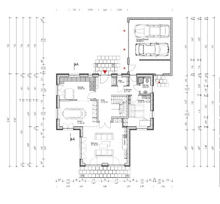 Eingang: gedanklich Garderobe und Abstellkammer entfernen. Dann an die Nordseite der Treppe eine neue Garderobe hin, gerne tiefer als die üblichen 60/65 cm. Dann an die Außenwand zwischen Haupt- und Garageneingang Sitzbank und Schuhschrank hin. Schöne Türen zur Garage kosten Geld, wenn nicht ausreichend vorhanden, kann man die Tür durch geeignete Maßnahmen verstecken.