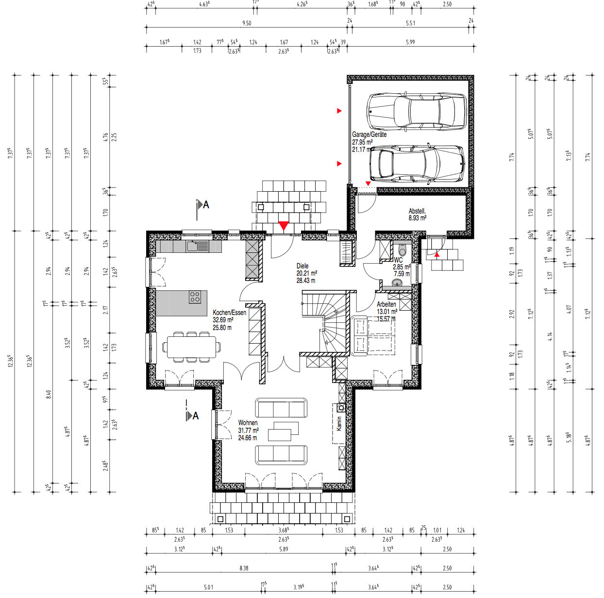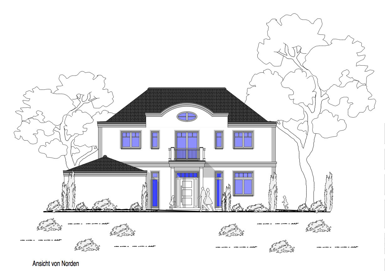 Dann mal schauen, ob man auf die beiden schmalen Fenster oben verzichten kann, damit das eine Kinderzimmer mehr Stellfläche hat (Ansicht Eingangsseite).