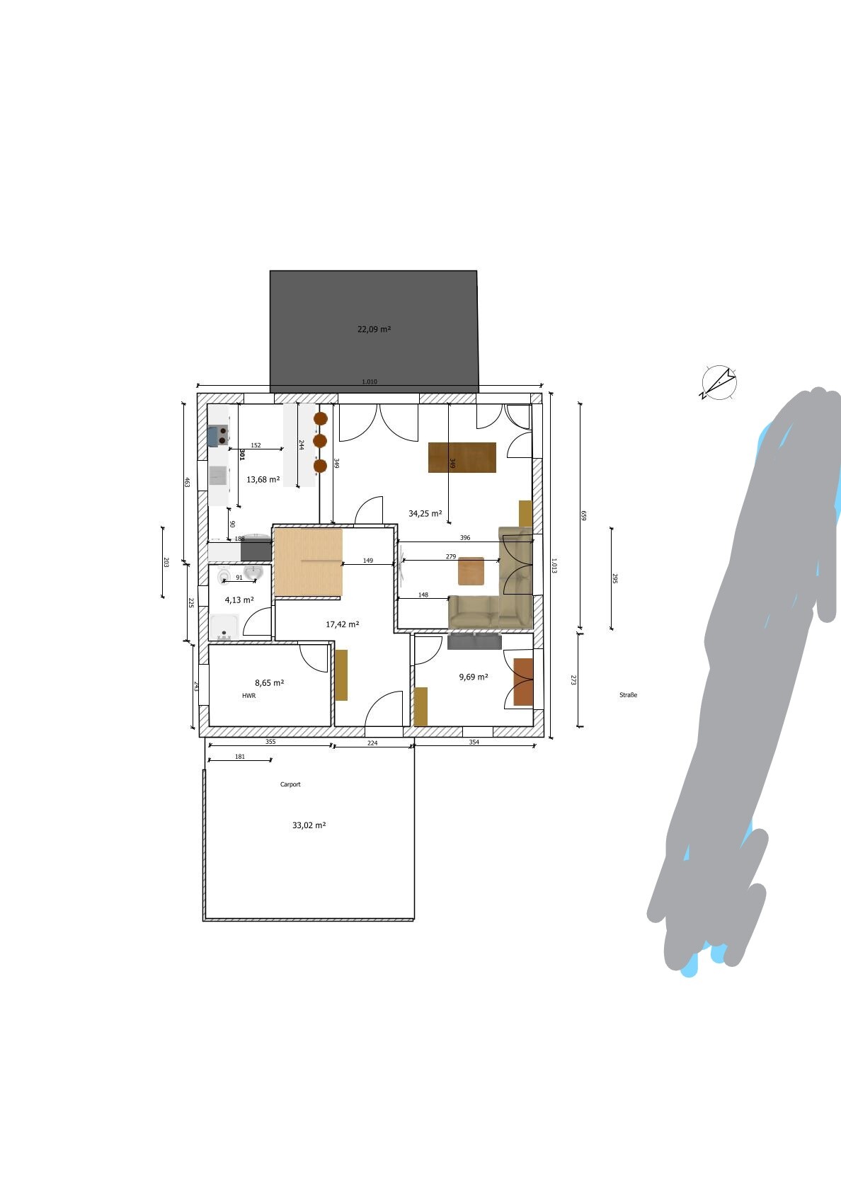Carport und Terrasse sind größentechnisch noch nicht exakt, sondern sollen nur erstmal zeigen wo sie hin sollen.