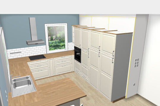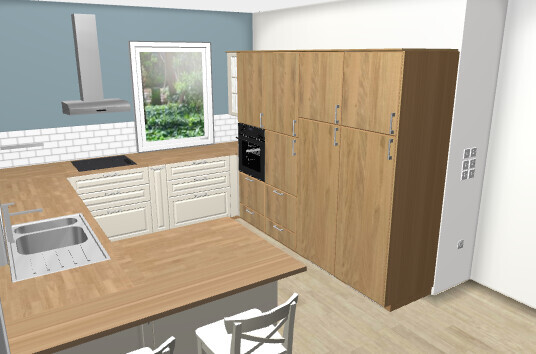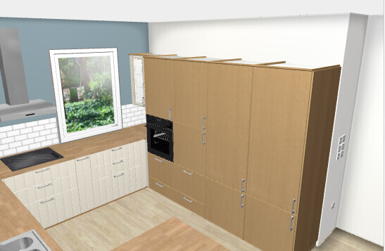 Für diese unglückliche Ecke habe ich jetzt einen Hängeschrank geplant... darunter Freiraum bis zur Arbeitsplatte - das passt wegen der Arbeitsplatte sonst halt sehr schlecht mit dem Raster.