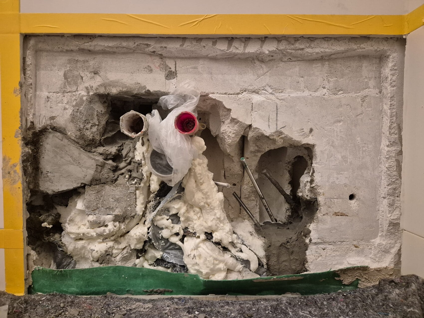 Den übrigen Gipsputz entfernt, und eine Wediplatte auf die entstandene Fläche geklebt.