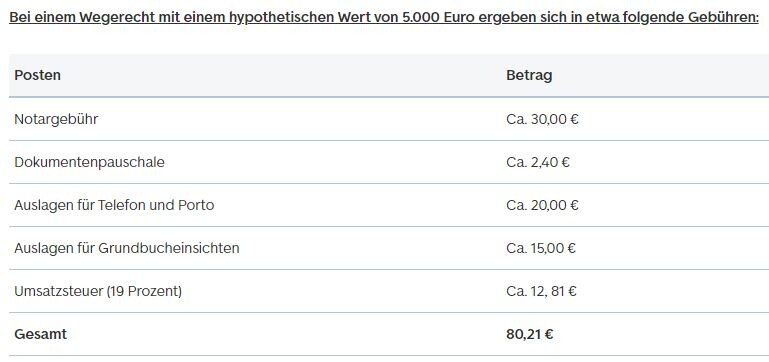 Die Gebühren errechnen sich aus dem Wert des Wegerechts. Eine Wegerecht erhöht in dem Fall den Wert des Grundstücks B und vermindert den Wert des Grundstücks A. Sowas lässt sich hoch oder runter rechnen, ganz nach belieben. Da Grundstück B einen weiteren Zugang hätte (wenn auch nicht schön über Garten) und Grundstück A ja sowieso schon eine Wegerecht für Grundstück C eingetragen hat (ist das so?), würde ich die Wertansätze hier sehr gering ansetzen. Anbei ein Beispiel für 5000€ Wertdifferenz (Notarkosten) und zusätzlich bei 5000€ ca. 56€ Gebühr für die Eintragung ans Grundbuchamt.