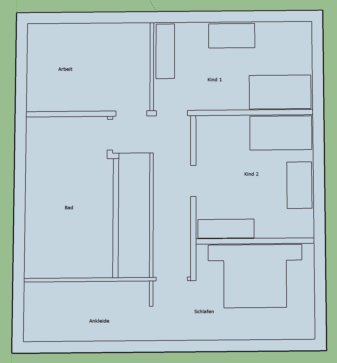Oben haben wir dann das Büro in den Nord/ Osten gelegt. Das erste Kinderzimmer liegt nun im Südosten, das zweite im Süden und das Elternschlafzimmer im Südwesten.
