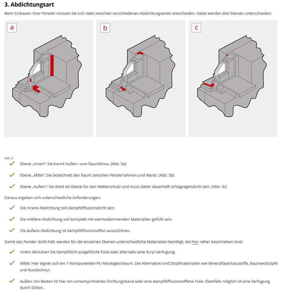 Auf Bild 1 bis 3 ist die jetzige Abdichtung zu sehen. So muss es sein.Bei mir ist auf der Innenseite der Fenster so ein schwarzes Klebeband mit stoffähnlichen Oberfläche. Darunter, wenn ich es richtig verstanden habe, Bauschaum, den man teilweise durch das Klebeband ertasten kann.