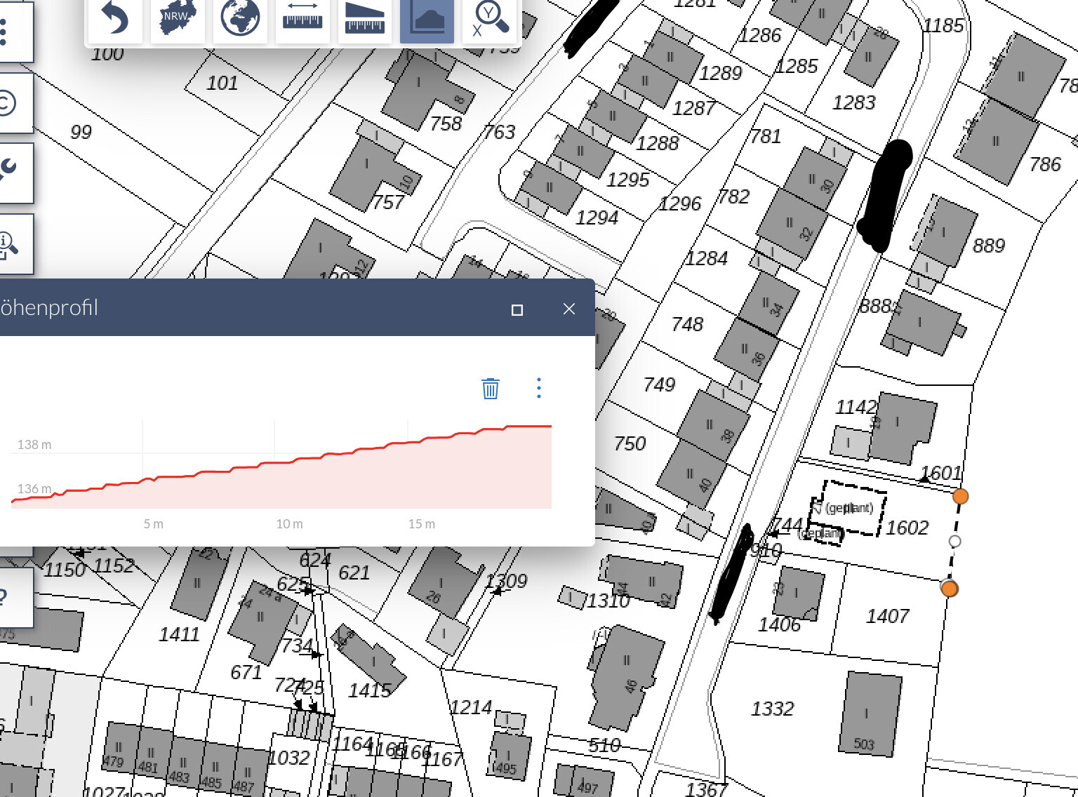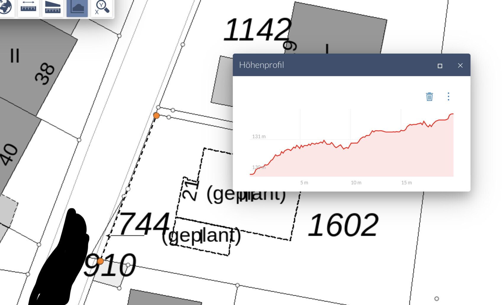 Im Bayernatlas kann man mit einem Messwerkzeug Längen messen und dann zeigt das System den Höhenverlauf mit an. Ok hab ich mal versucht einmal quer durchs Grundstück durch.GS744 keine Ahnung ehrlich gesagt. Ich nehme an der Stadt. Es wird online als 6qm Straßenverkehr ausgezeichnet.