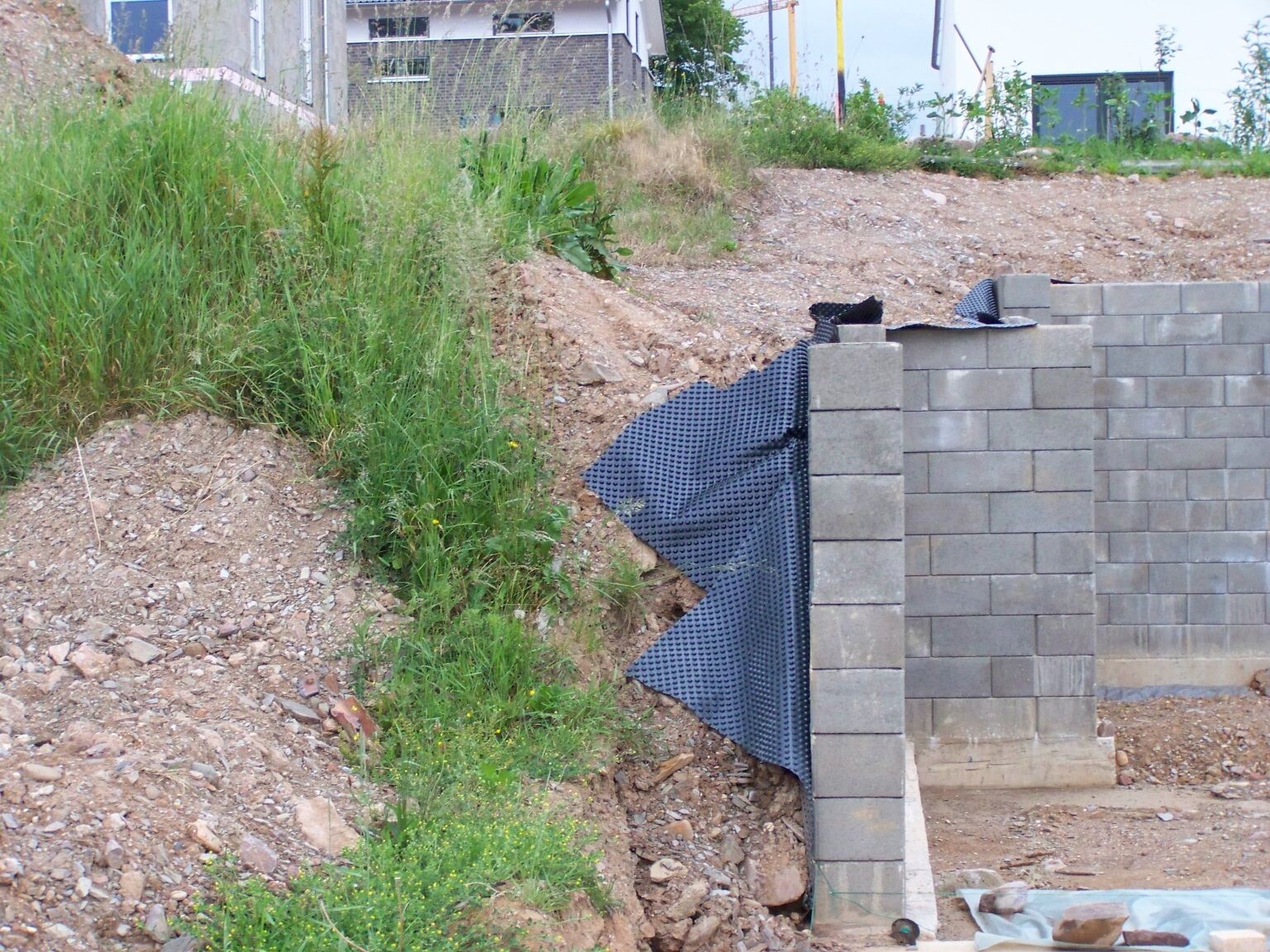 Da die Nachbarn die Mauer direkt auf die Grundstück-Grenze gesetzt haben, müssen wir ja auf unserer Seite abböschen oder ggf. sogar den oberen Bereich des Grundstück auf 2 m begradigen und unsere Terrasse wahrscheinlich "Ständern".